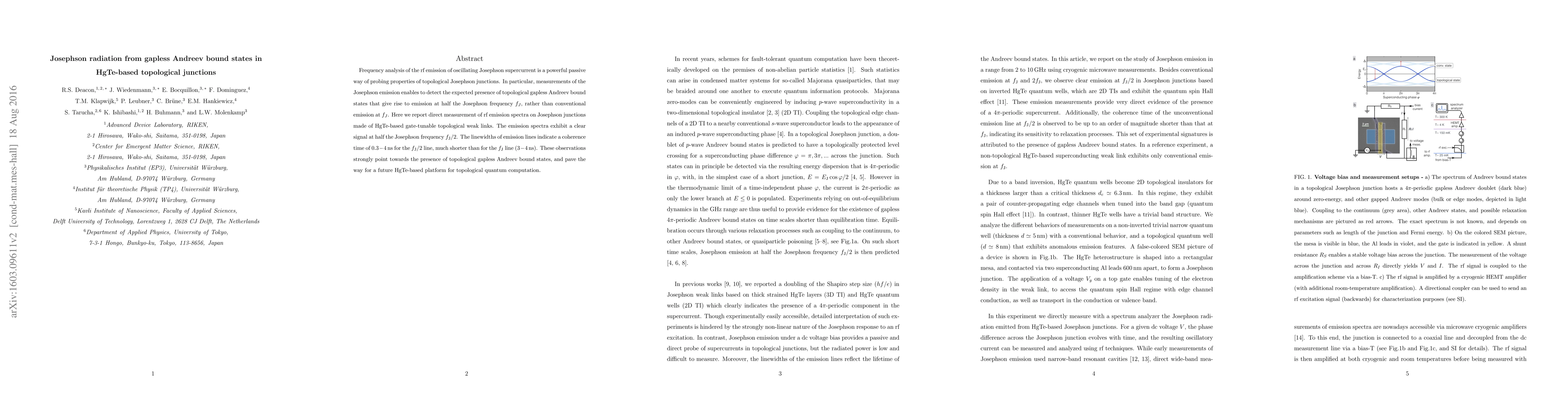 This study reports direct measurement of rf emission spectra from HgTe-based topological Josephson junctions, revealing a clear signal at half the Josephson frequency $f_{\rm J}/2$, indicative of topological gapless Andreev bound states. The coherence times for the $f_{\rm J}/2$ line are much shorter, supporting the presence of these states and promising a new platform for topological quantum computation.