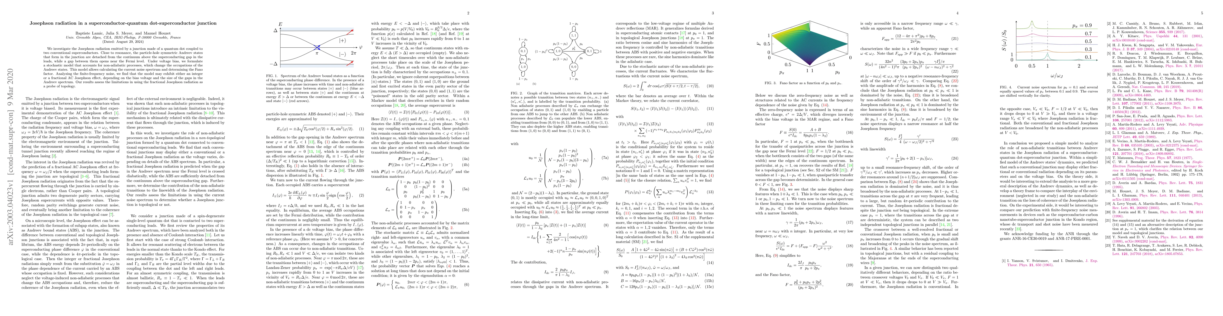 This paper investigates Josephson radiation in a superconductor-quantum dot-superconductor junction, revealing that the junction can exhibit either integer or fractional AC Josephson effect under voltage bias. The study formulates a stochastic model to account for non-adiabatic processes, determining the current noise spectrum and Fano factor, and assesses the limitations of using fractional Josephson radiation for topological probing.