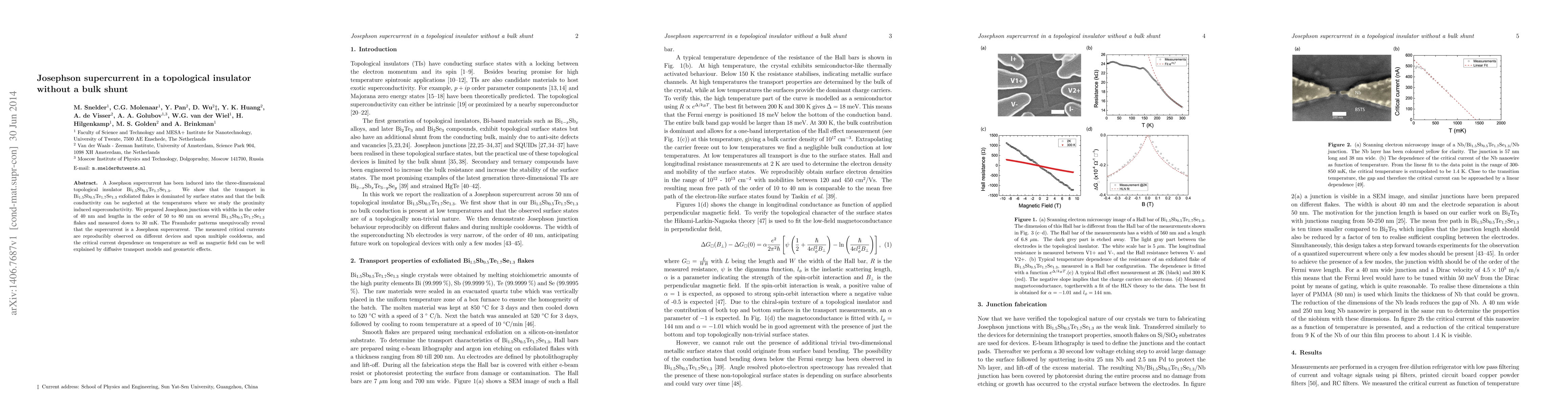 This paper demonstrates the induction of a Josephson supercurrent in the topological insulator Bi1.5Sb0.5Te1.7Se1.3, showing that surface states dominate transport, while bulk conductivity is negligible. The study reveals reproducible critical currents in Josephson junctions, consistent with diffusive transport models and geometric effects.