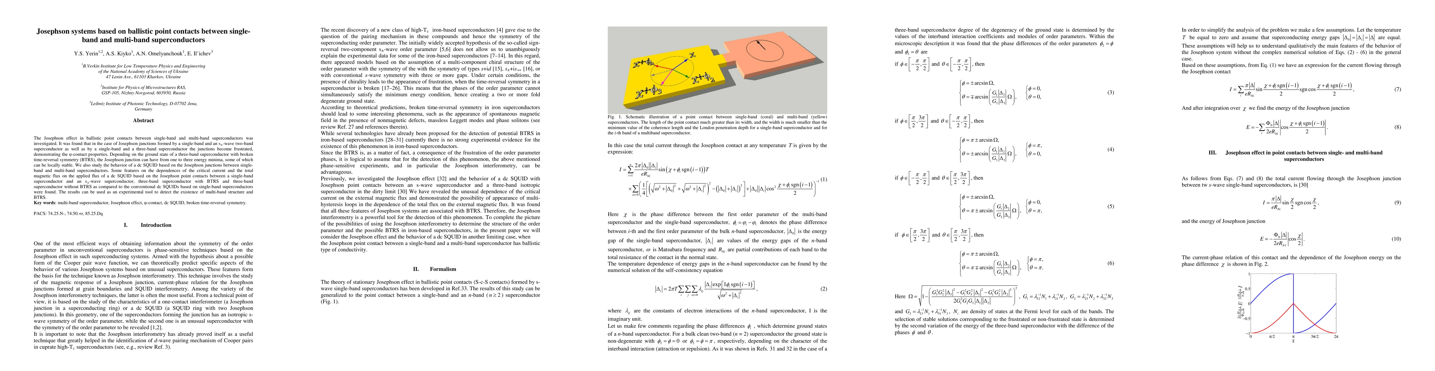 This paper investigates the Josephson effect in ballistic point contacts between single-band and multi-band superconductors, revealing that junctions with $s_\pm$-wave and three-band superconductors exhibit $\phi$-contact properties and multiple energy minima. The study also explores the behavior of dc SQUIDs based on these junctions, identifying unique features that can detect multi-band structures and broken time-reversal symmetry.