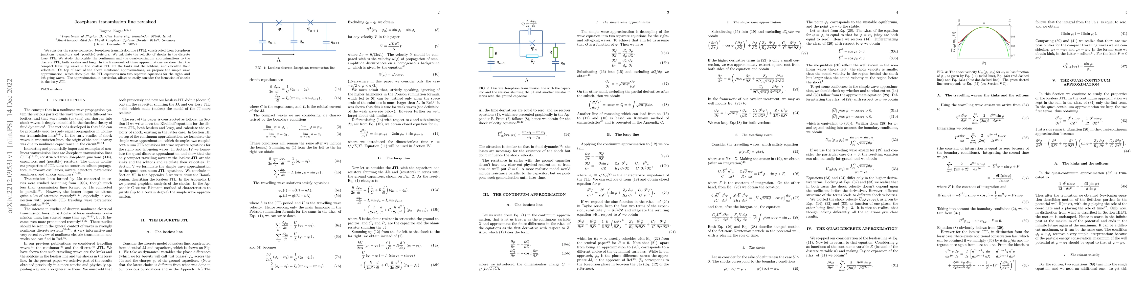 This paper revisits the Josephson transmission line (JTL) composed of Josephson junctions, capacitors, and resistors, focusing on the velocity of shocks within a discrete lossy JTL. It explores continuum and quasi-continuum approximations, revealing that the lossless JTL supports kinks and solitons, and proposes a simple wave approximation that simplifies the analysis of shock formation in lossy conditions.