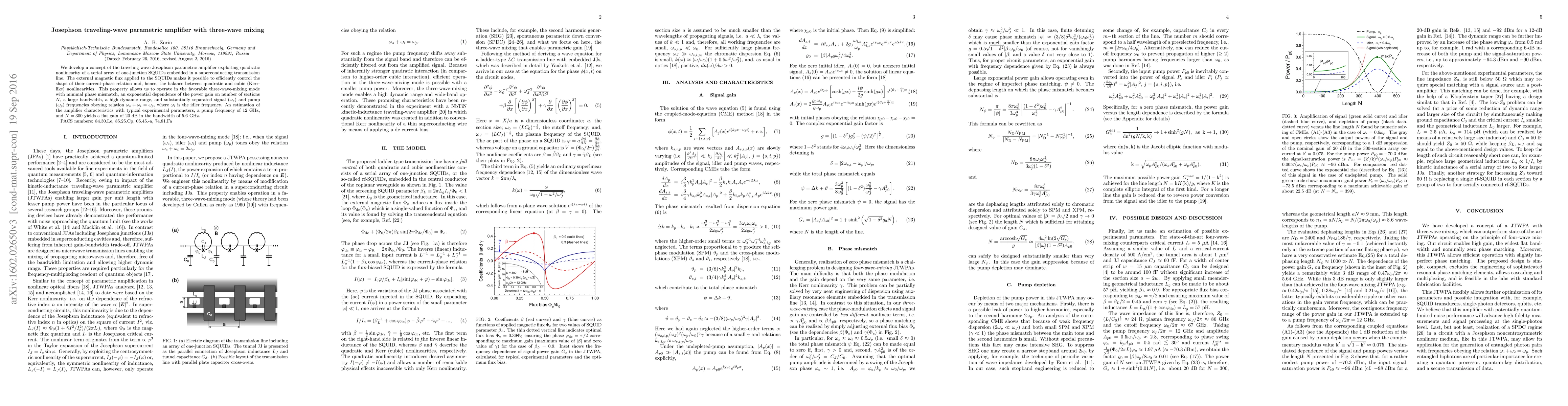 This paper introduces a traveling-wave Josephson parametric amplifier utilizing three-wave mixing in a serial array of SQUIDs for enhanced signal amplification. The design achieves high gain, large bandwidth, and minimal phase mismatch, with an estimated gain of 20 dB over a 5.6 GHz bandwidth.