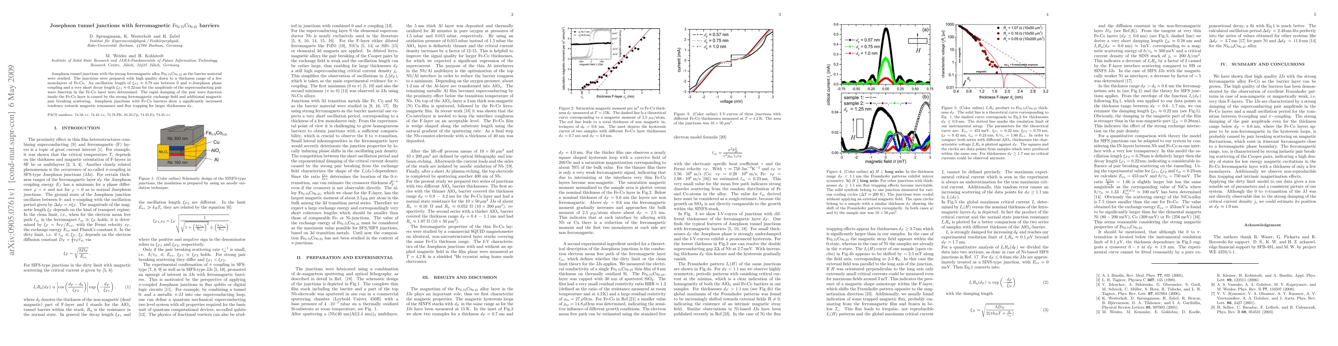 This study investigates high-quality Josephson tunnel junctions using ferromagnetic $\Fe_{0.75}\Co_{0.25}$ barriers, revealing oscillations in phase coupling and a rapid decay of the superconducting pair wave function due to strong ferromagnetic exchange and magnetic scattering. Larger barrier thicknesses exhibit enhanced magnetic remanence and flux trapping.