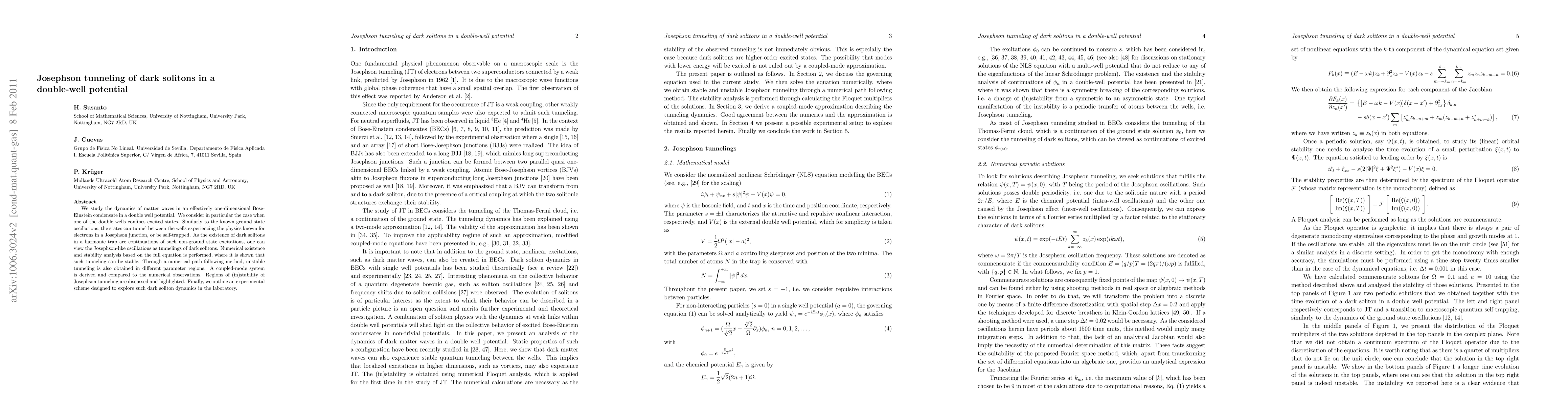 We study the dynamics of matter waves in an effectively one-dimensional Bose-Einstein condensate in a double well potential. We consider in particular the case when one of the double wells confines excited states. Similarly to the known ground state oscillations, the states can tunnel between the wells experiencing the physics known for electrons in a Josephson junction, or be self-trapped. As the existence of dark solitons in a harmonic trap are continuations of such non-ground state excitations, one can view the Josephson-like oscillations as tunnelings of dark solitons. Numerical existence and stability analysis based on the full equation is performed, where it is shown that such tunneling can be stable. Through a numerical path following method, unstable tunneling is also obtained in different parameter regions. A coupled-mode system is derived and compared to the numerical observations. Regions of (in)stability of Josephson tunneling are discussed and highlighted. Finally, we outline an experimental scheme designed to explore such dark soliton dynamics in the laboratory.