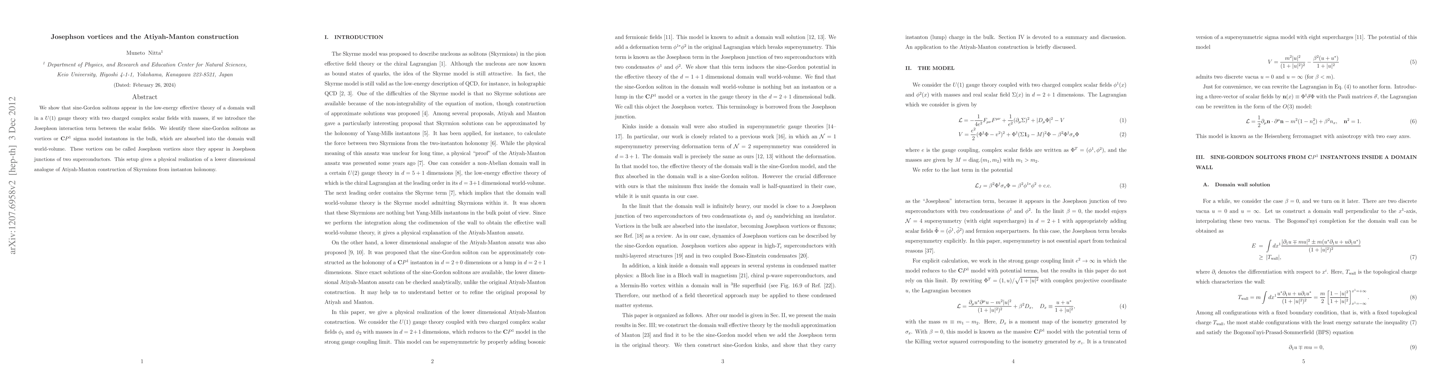This paper demonstrates that sine-Gordon solitons, identified as Josephson vortices, emerge in the low-energy effective theory of a domain wall in a U(1) gauge theory with Josephson interaction. These vortices are analogous to instantons absorbed into the domain wall, providing a physical realization of the Atiyah-Manton construction of Skyrmions.