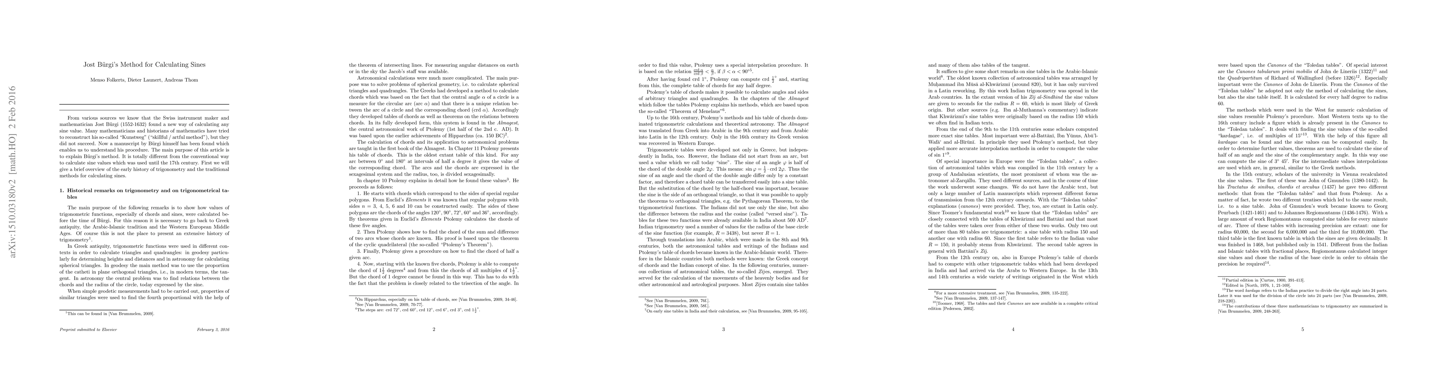 A 16th-century Swiss mathematician, Jost B"urgi, developed a new method for calculating sines using only additions and halving, which converges quickly and is proven correct with modern analysis.