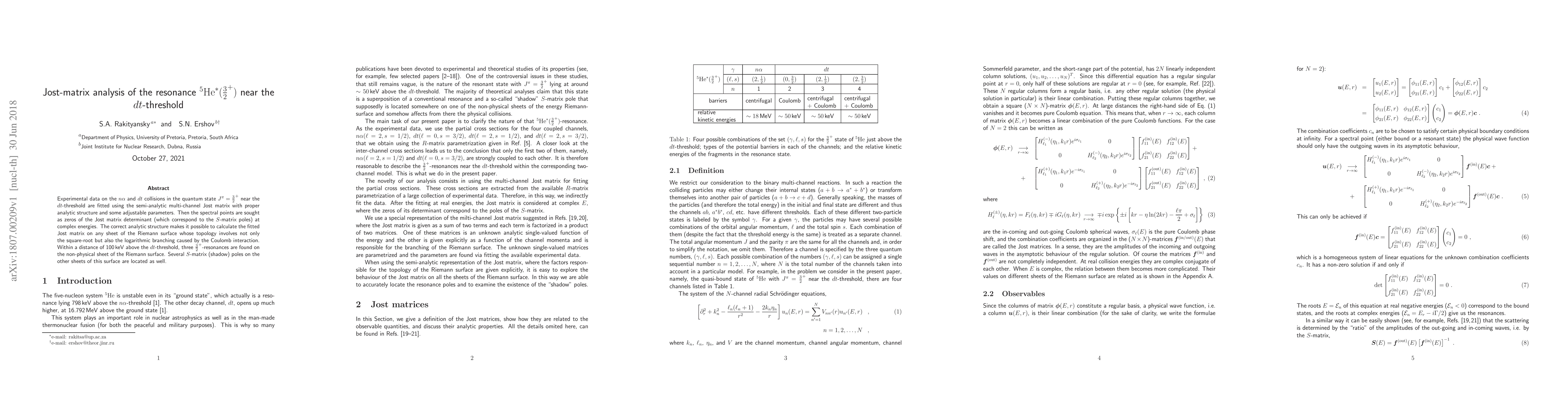This research uses a semi-analytic multi-channel Jost matrix to fit experimental data on n-alpha and dt collisions near the dt-threshold, revealing three 3/2+ resonances within 100 keV above the threshold on the non-physical sheet of the Riemann surface, along with several S-matrix poles on other sheets, facilitated by proper analytic structure accounting for Coulomb interaction-induced branching.