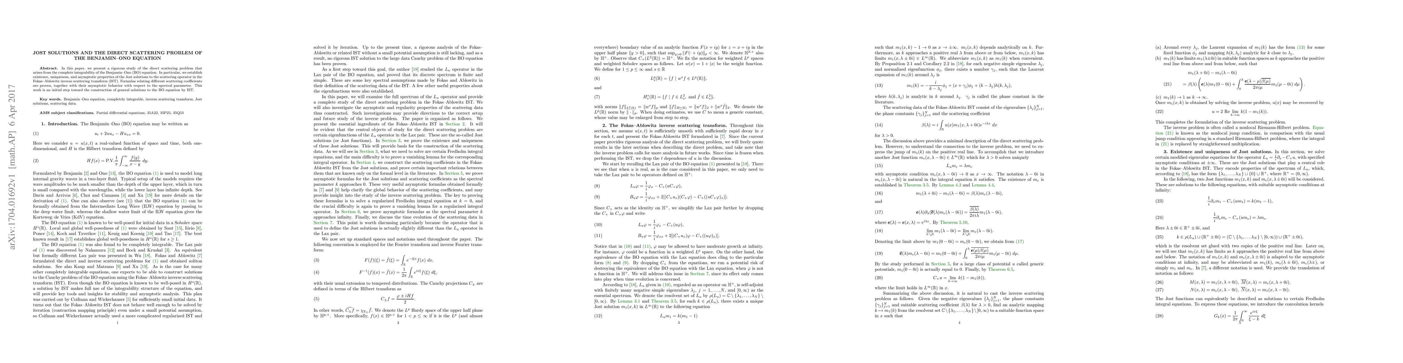 This paper rigorously investigates the direct scattering problem stemming from the Benjamin-Ono equation's complete integrability, establishing the existence, uniqueness, and asymptotic properties of Jost solutions in the Fokas-Ablowitz inverse scattering transform. It also proves formulas for scattering coefficients and their asymptotic behavior, laying groundwork for constructing general BO equation solutions via inverse scattering transform.