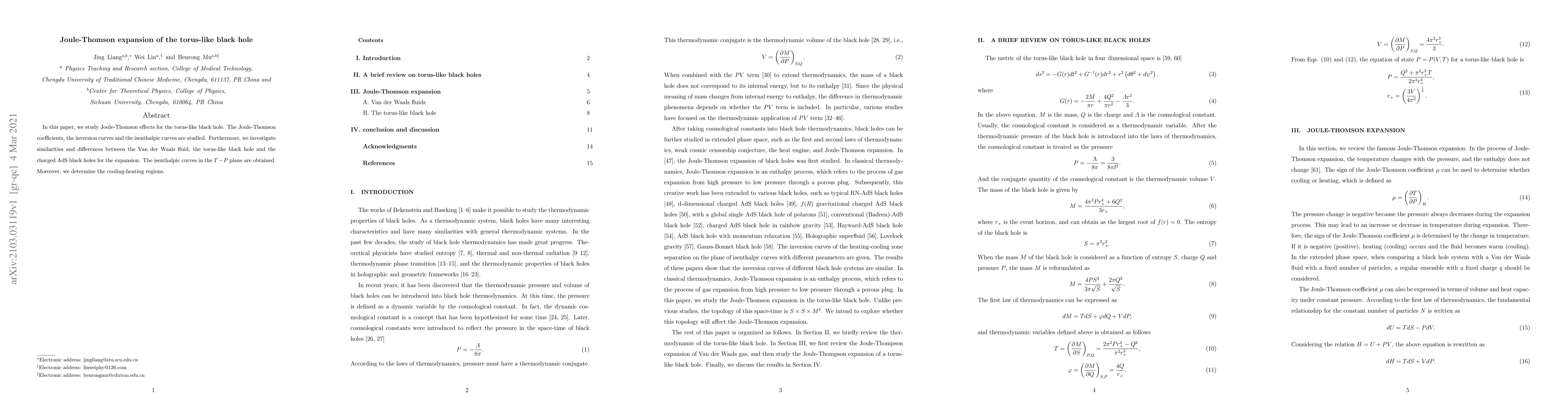 In this paper, we study Joule-Thomson effects for the torus-like black hole. The Joule-Thomson coefficients, the inversion curves and the isenthalpic curves are studied. Furthermore, we investigate similarities and differences between the Van der Waals fluid, the torus-like black hole and the charged AdS black holes for the expansion. The isenthalpic curves in the $T-P$ plane are obtained. Moreover, we determine the cooling-heating regions.