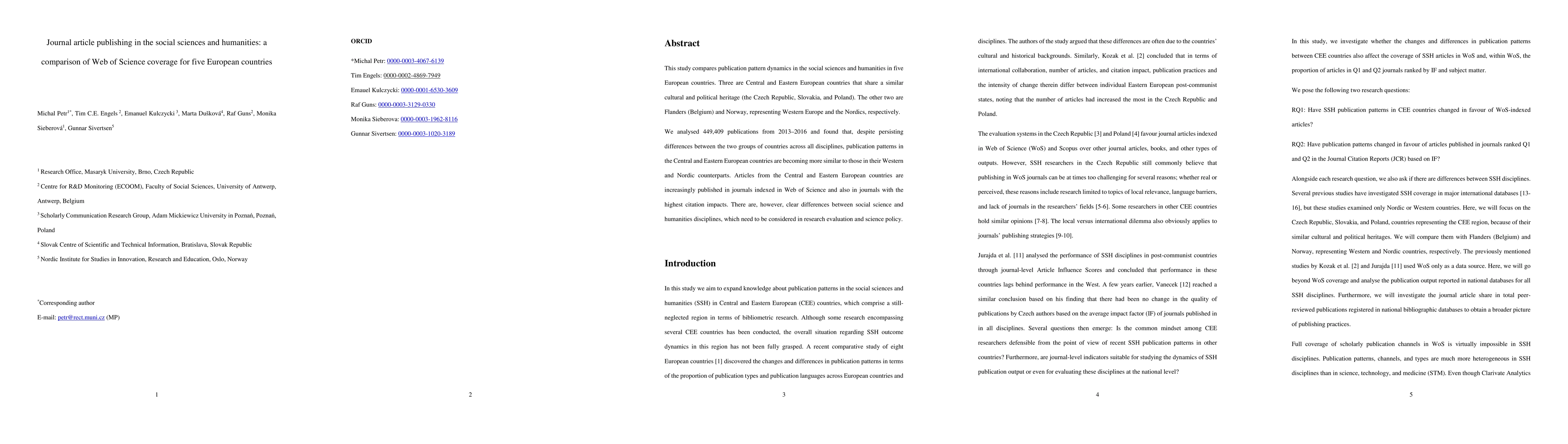 This study compares publication pattern dynamics in the social sciences and humanities in five European countries. Three are Central and Eastern European countries that share a similar cultural and political heritage (the Czech Republic, Slovakia, and Poland). The other two are Flanders (Belgium) and Norway, representing Western Europe and the Nordics, respectively. We analysed 449,409 publications from 2013-2016 and found that, despite persisting differences between the two groups of countries across all disciplines, publication patterns in the Central and Eastern European countries are becoming more similar to those in their Western and Nordic counterparts. Articles from the Central and Eastern European countries are increasingly published in journals indexed in Web of Science and also in journals with the highest citation impacts. There are, however, clear differences between social science and humanities disciplines, which need to be considered in research evaluation and science policy.