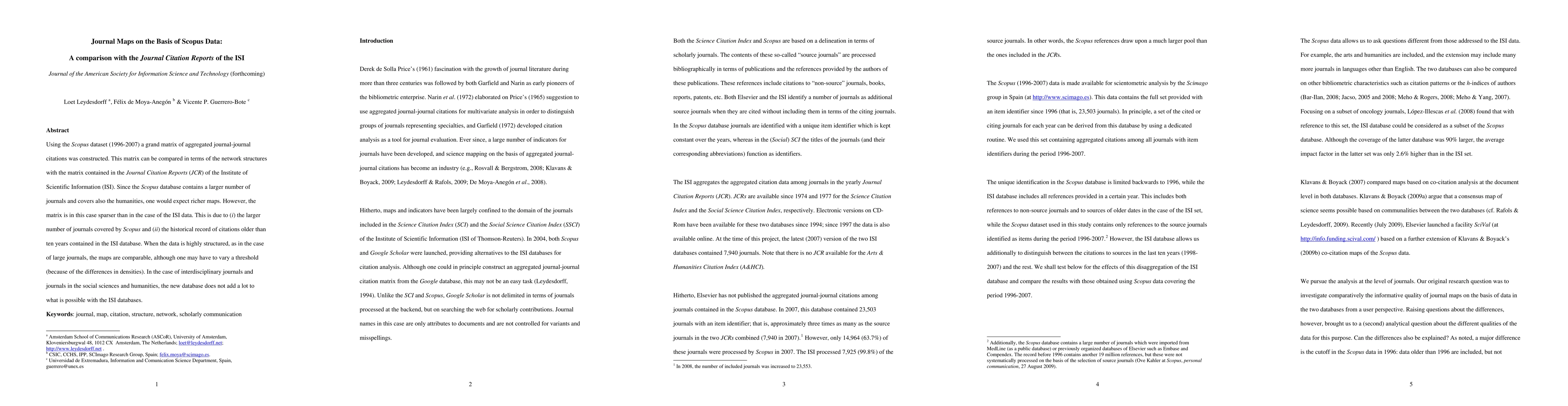 This study compares citation networks derived from Scopus data with those from ISI's Journal Citation Reports, finding that while Scopus covers more journals, its citation matrix is sparser due to its broader scope and older citation records in ISI. The citation maps are comparable for large journals but less so for interdisciplinary and humanities journals.
