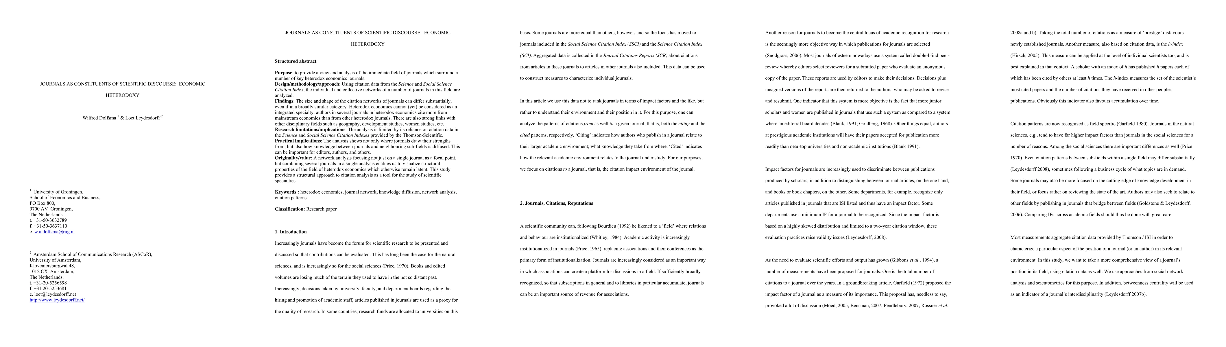 A study analyzed journal citation networks in heterodox economics, finding diversity in citation patterns and strong links to mainstream economics and other disciplines. The field remains fragmented with authors citing more from mainstream journals than their own.