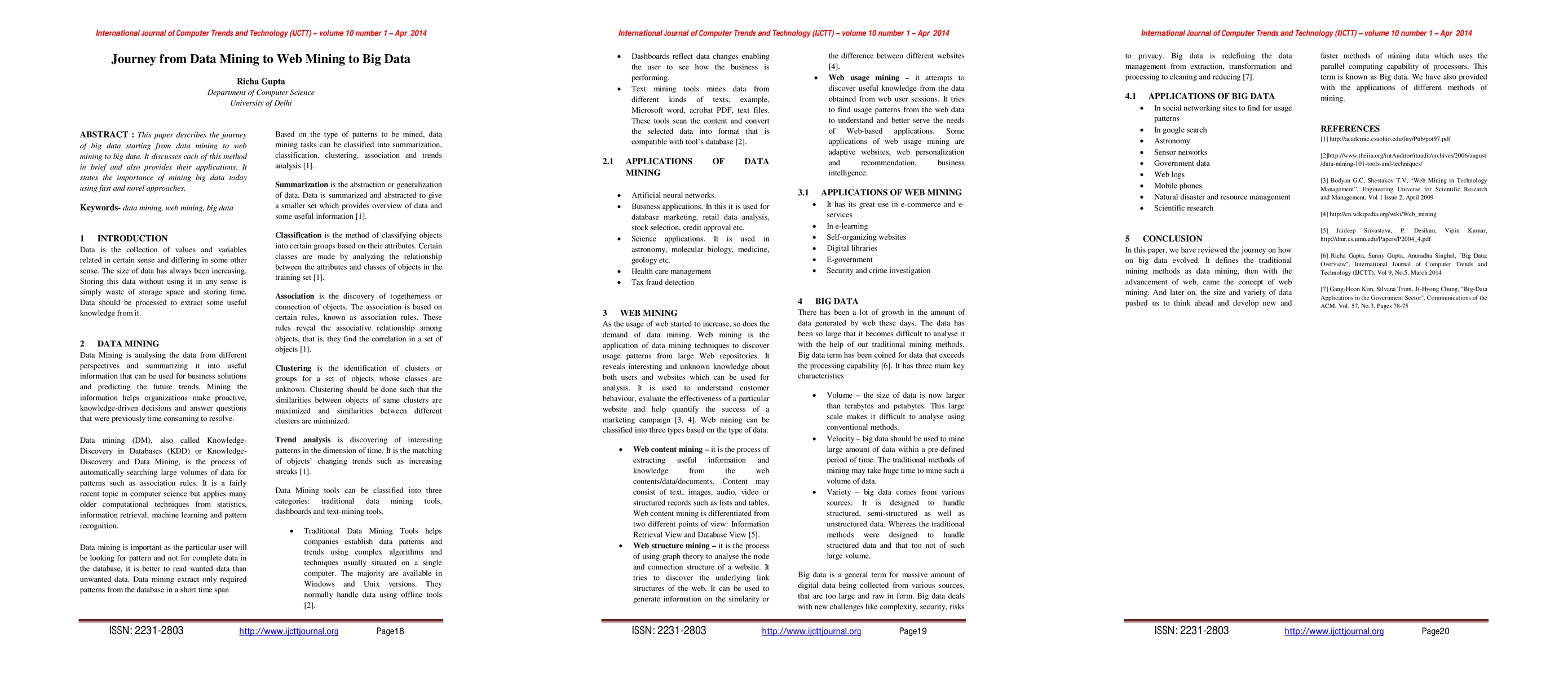 The research describes the journey of big data from data mining to web mining to big data, discussing each method in brief and providing their applications.