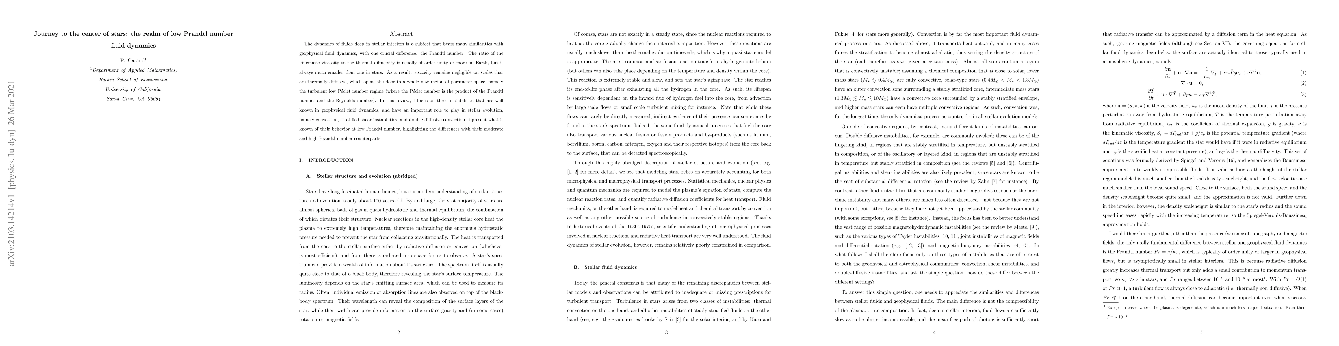 This paper reviews the dynamics of fluids in stellar interiors, focusing on the low Prandtl number regime. It explores three key instabilities—convection, stratified shear instabilities, and double-diffusive convection—and contrasts their behavior under low Prandtl numbers compared to moderate and high values.