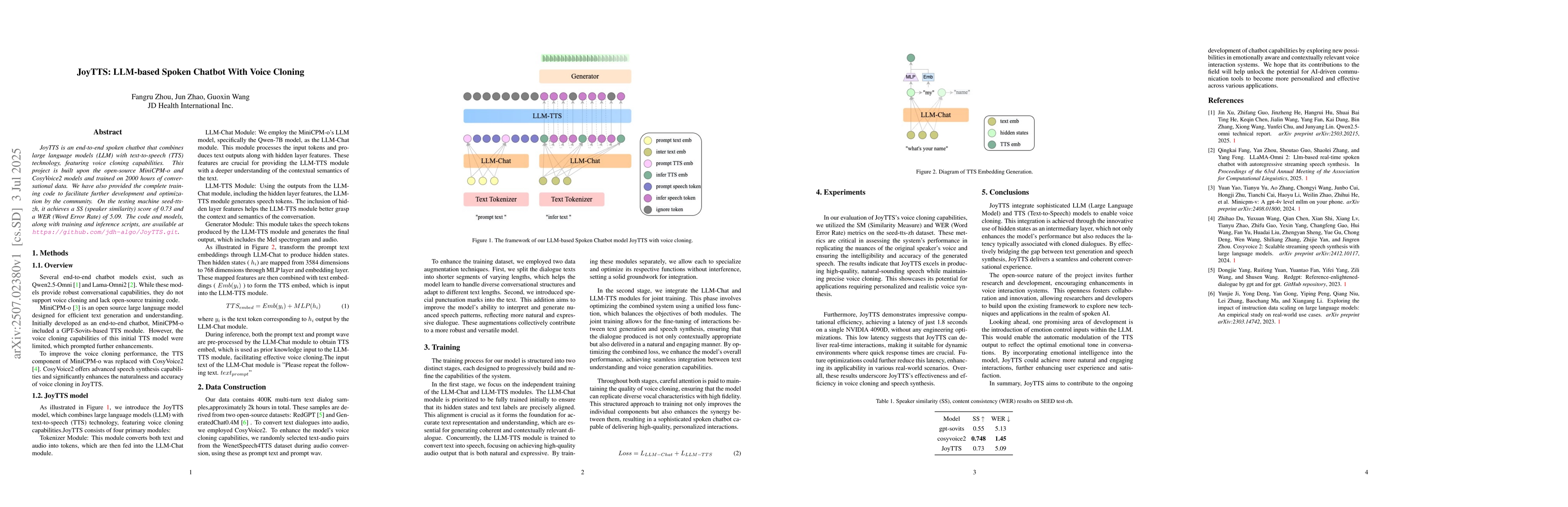 This research is significant as it presents JoyTTS, a sophisticated spoken chatbot that effectively bridges the gap between text generation and speech synthesis, enabling high-quality, personalized interactions. Its open-source nature fosters collaboration and innovation, potentially unlocking the potential for AI-driven communication tools to become more personalized and effective across various applications.