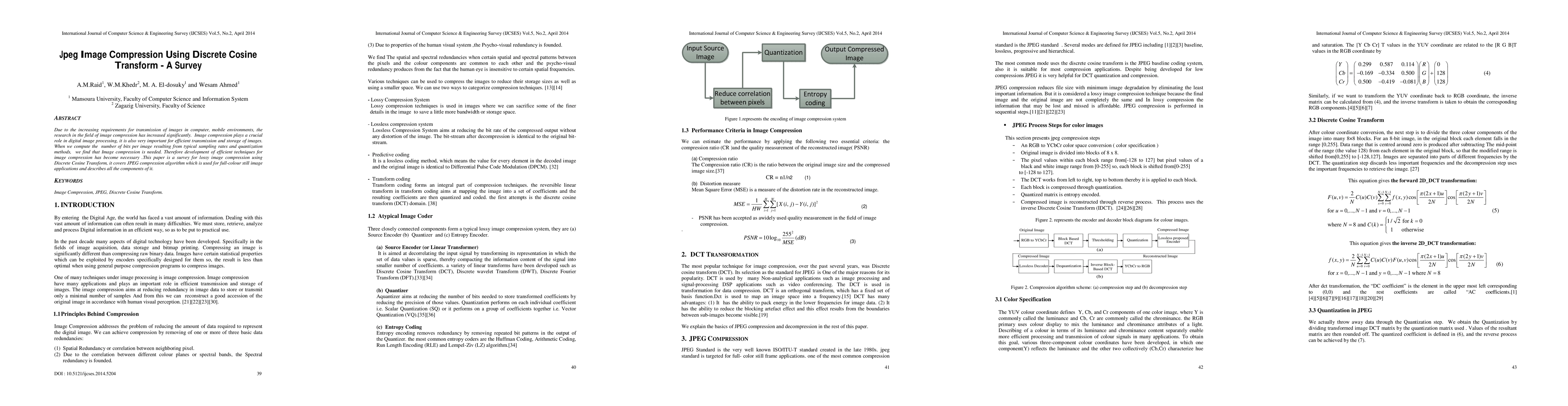 This paper surveys the JPEG image compression technique using Discrete Cosine Transform (DCT), emphasizing its role in efficient digital image processing, transmission, and storage. It details the JPEG algorithm components and their application in compressing full-color still images.