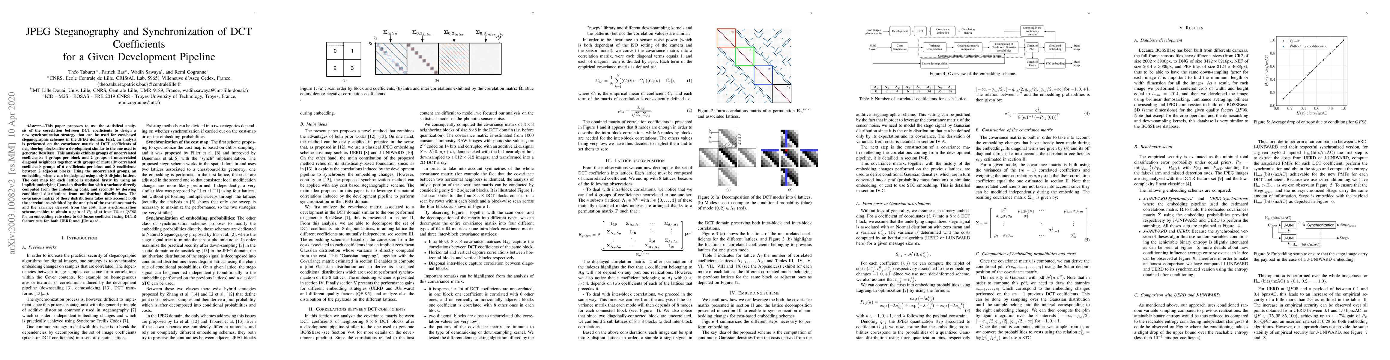 This short paper proposes to use the statistical analysis of the correlation between DCT coefficients to design a new synchronization strategy that can be used for cost-based steganographic schemes in the JPEG domain. First, an analysis is performed on the covariance matrix of DCT coefficients of neighboring blocks after a development similar to the one used to generate BossBase. This analysis exhibits groups of uncorrelated coefficients: 4 groups per block and 2 groups of uncorrelated diagonal neighbors together with groups of mutually correlated coefficients groups of 6 coefficients per blocs and 8 coefficients between 2 adjacent blocks. Using the uncorrelated groups, an embedding scheme can be designed using only 8 disjoint lattices. The cost map for each lattice is updated firstly by using an implicit underlying Gaussian distribution with a variance directly computed from the embedding costs, and secondly by deriving conditional distributions from multivariate distributions. The covariance matrix of these distributions takes into account both the correlations exhibited by the analysis of the covariance matrix and the variance derived from the cost. This synchronization scheme enables to obtain a gain of PE of 5% at QF 95 for an embedding rate close to 0.3 bnzac coefficient using DCTR feature sets.