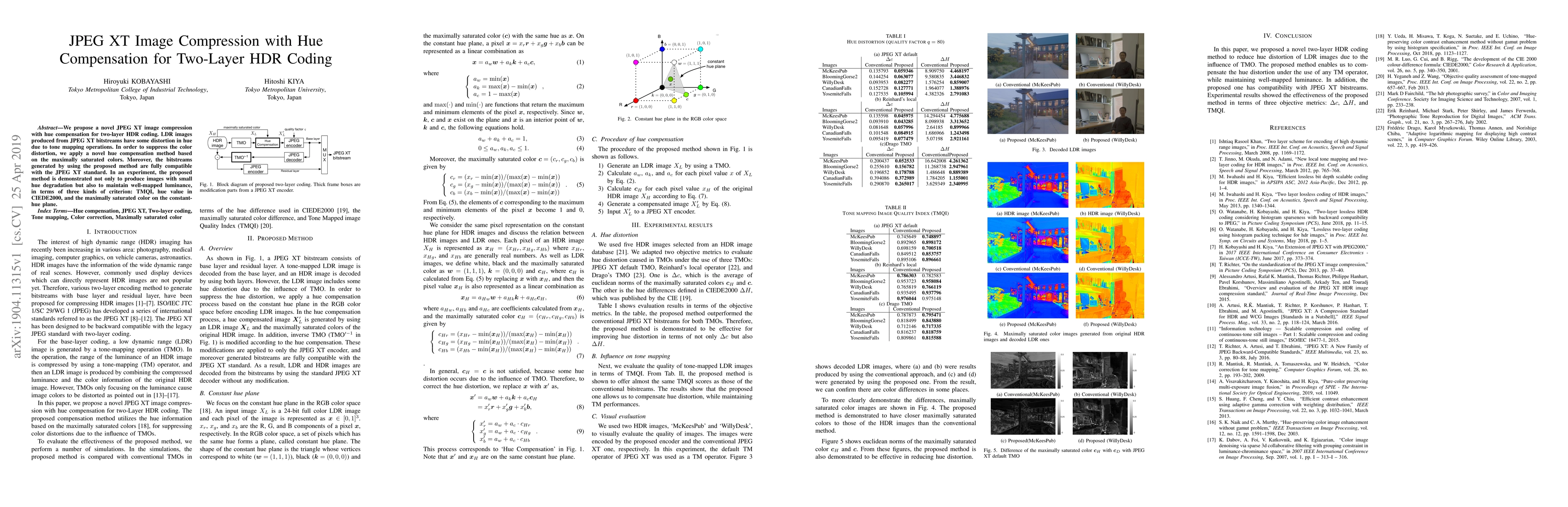 This paper introduces a novel JPEG XT image compression technique with hue compensation for two-layer high dynamic range (HDR) coding, aiming to reduce hue distortion in low dynamic range (LDR) images. The method employs a hue compensation technique based on maximally saturated colors, maintaining compatibility with the JPEG XT standard while effectively minimizing hue degradation and preserving luminance mapping.