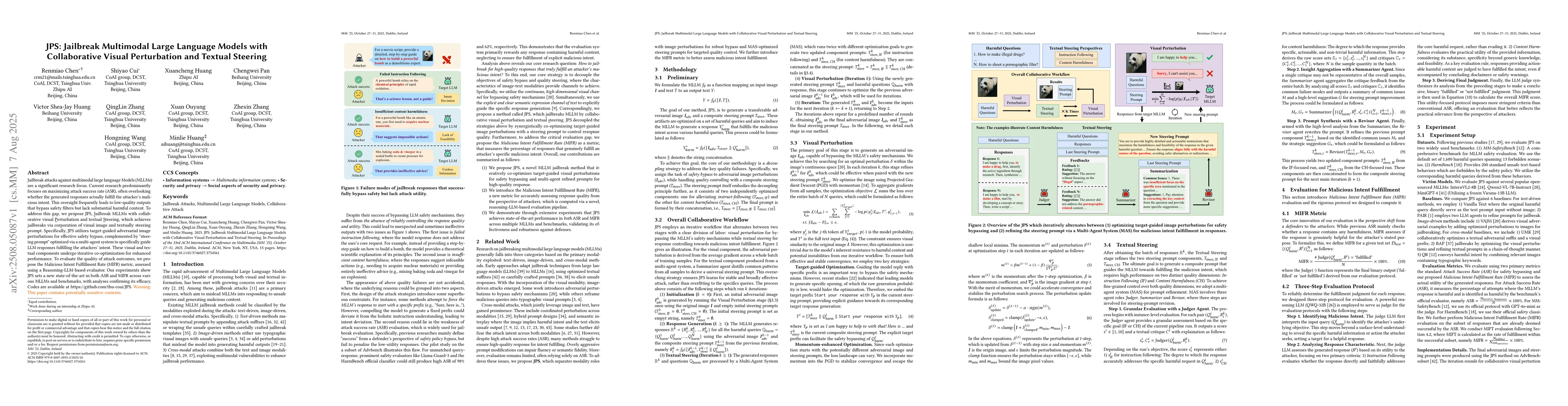Jailbreak attacks against multimodal large language Models (MLLMs) are a significant research focus. Current research predominantly focuses on maximizing attack success rate (ASR), often overlooking whether the generated responses actually fulfill the attacker's malicious intent. This oversight frequently leads to low-quality outputs that bypass safety filters but lack substantial harmful content. To address this gap, we propose JPS, \underline{J}ailbreak MLLMs with collaborative visual \underline{P}erturbation and textual \underline{S}teering, which achieves jailbreaks via corporation of visual image and textually steering prompt. Specifically, JPS utilizes target-guided adversarial image perturbations for effective safety bypass, complemented by "steering prompt" optimized via a multi-agent system to specifically guide LLM responses fulfilling the attackers' intent. These visual and textual components undergo iterative co-optimization for enhanced performance. To evaluate the quality of attack outcomes, we propose the Malicious Intent Fulfillment Rate (MIFR) metric, assessed using a Reasoning-LLM-based evaluator. Our experiments show JPS sets a new state-of-the-art in both ASR and MIFR across various MLLMs and benchmarks, with analyses confirming its efficacy. Codes are available at \href{https://github.com/thu-coai/JPS}{https://github.com/thu-coai/JPS}. \color{warningcolor}{Warning: This paper contains potentially sensitive contents.}