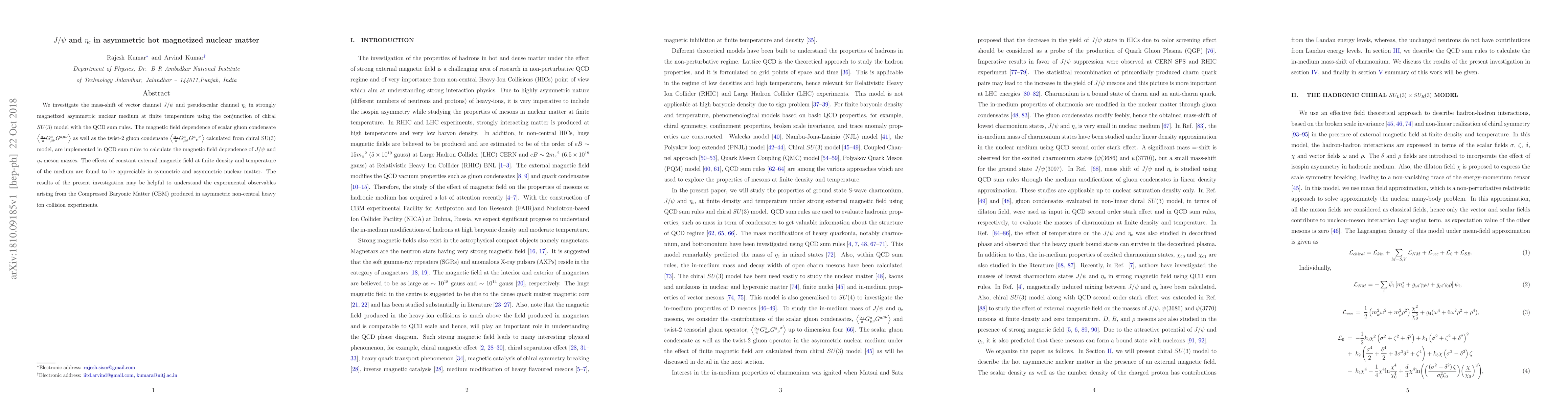 We investigate the mass-shift of vector channel $J/\psi$ and pseudoscalar channel $\eta_c$ in strongly magnetized asymmetric nuclear medium at finite temperature using the conjunction of chiral $SU(3)$ model with the QCD sum rules. The magnetic field dependence of scalar gluon condensate $\left\langle \frac{\alpha_{s}}{\pi} G^a_{\mu\nu} {G^a}^{\mu\nu} \right\rangle$ as well as the twist-2 gluon condensate $\left\langle \frac{\alpha_{s}}{\pi} G^a_{\mu\sigma} {{G^a}_\nu}^{\sigma} \right\rangle $ calculated from chiral SU($3$) model, are implemented in QCD sum rules to calculate the magnetic field dependence of $J/\psi$ and $\eta_c$ meson masses. The effects of constant external magnetic field at finite density and temperature of the medium are found to be appreciable in symmetric and asymmetric nuclear matter. The results of the present investigation may be helpful to understand the experimental observables arising from the Compressed Baryonic Matter (CBM) produced in asymmetric non-central heavy ion collision experiments.
