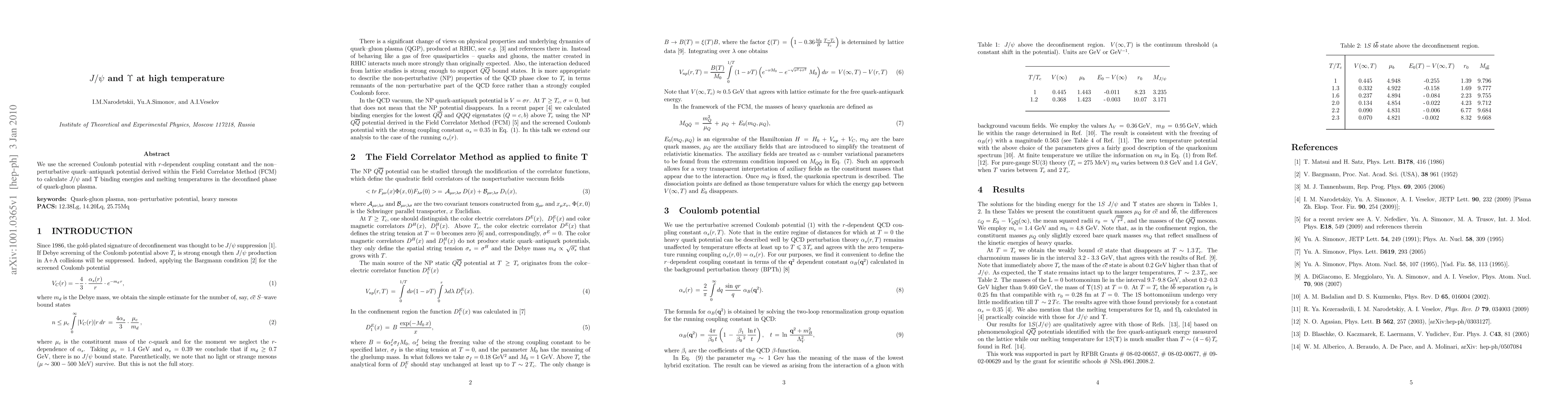 We use the screened Coulomb potential with $r$-dependent coupling constant and the non--perturbative quark--antiquark potential derived within Field Correlator Method (FCM) to calculate $J/\psi$ and $\Upsilon$ binding energies and melting temperatures in the deconfined phase of quark-gluon plasma.