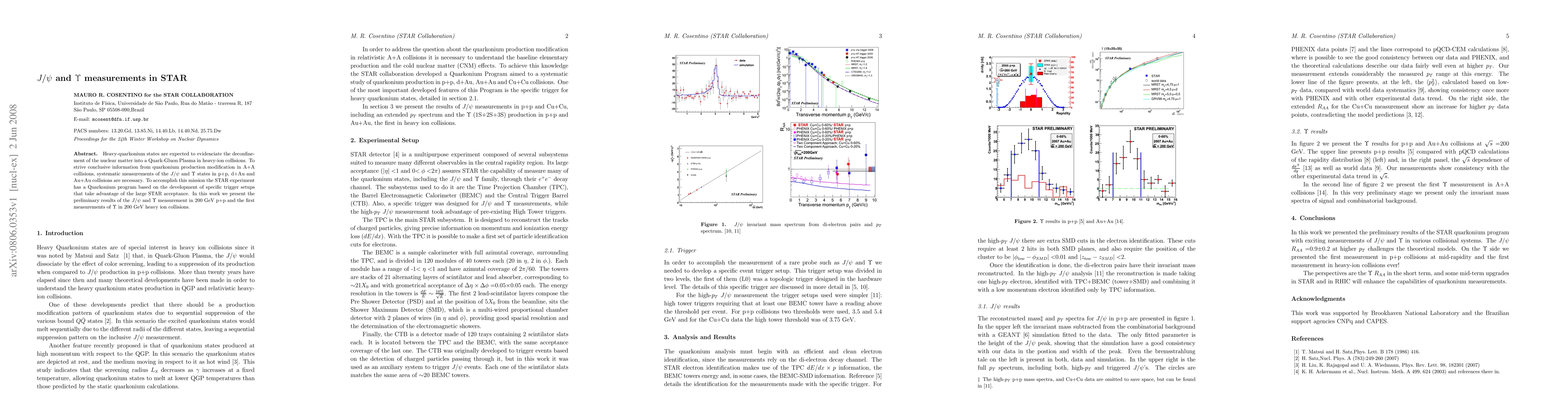 Heavy-quarkonium states are expected to evidenciate the deconfinement of the nuclear matter into a Quark-Gluon Plasma in heavy-ion collisions. To strive conclusive information from quarkonium production modification in A+A collisions, systematic measurements of the $J/\psi$ and $\Upsilon$ states in p+p, d+Au and Au+Au collisions are necessary. To accomplish this mission the STAR experiment has a Quarkonium program based on the development of specific trigger setups that take advantage of the large STAR acceptance. In this work we present the preliminary results of the $J/\psi$ and $\Upsilon$ measurement in 200 GeV p+p and the first measurements of $\Upsilon$ in 200 GeV heavy ion collisions.