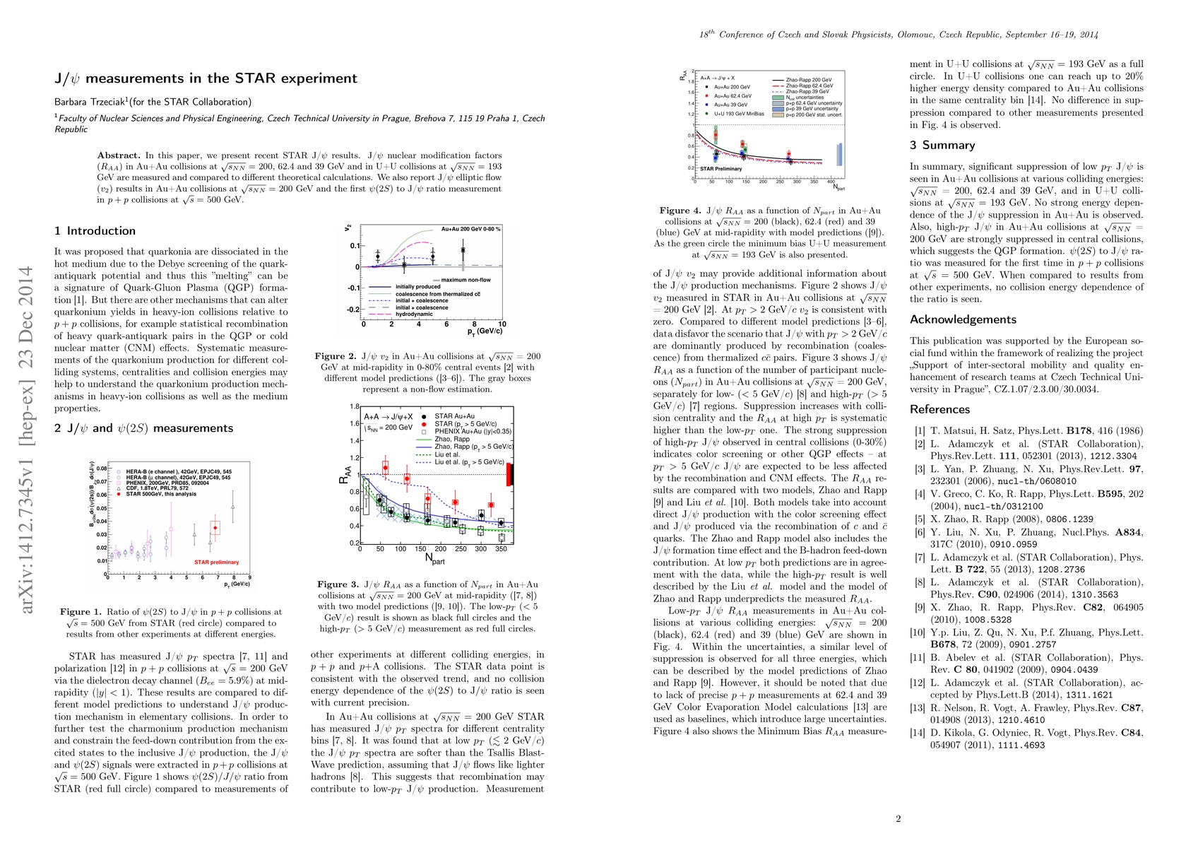 In this paper, we present recent STAR J/$\psi$ results. J/$\psi$ nuclear modification factors ($R_{AA}$) in Au+Au collisions at $\sqrt{s_{NN}} =$ 200, 62.4 and 39 GeV and in U+U collisions at $\sqrt{s_{NN}} =$ 193 GeV are measured and compared to different theoretical calculations. We also report J/$\psi$ elliptic flow ($v_{2}$) results in Au+Au collisions at $\sqrt{s_{NN}} =$ 200 GeV and the first $\psi(2S)$ to J/$\psi$ ratio measurement in $p+p$ collisions at $\sqrt{s} =$ 500 GeV.
