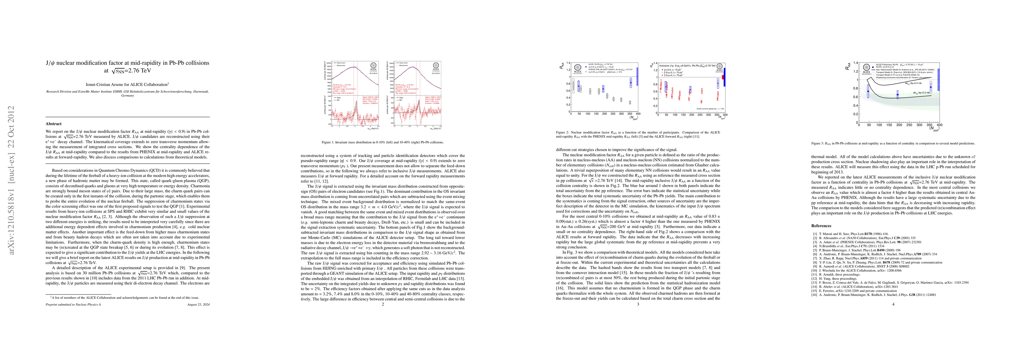 This paper reports on the J$\psi$ nuclear modification factor $R_{\rm AA}$ at mid-rapidity in Pb-Pb collisions at $\sqrt{s_{NN}}=$2.76 TeV, measured by ALICE, showing its centrality dependence and comparing it to PHENIX and theoretical models. The study reconstructs J$\psi$ candidates via their $e^+e^-$ decay channel and extends kinematical coverage to zero transverse momentum.