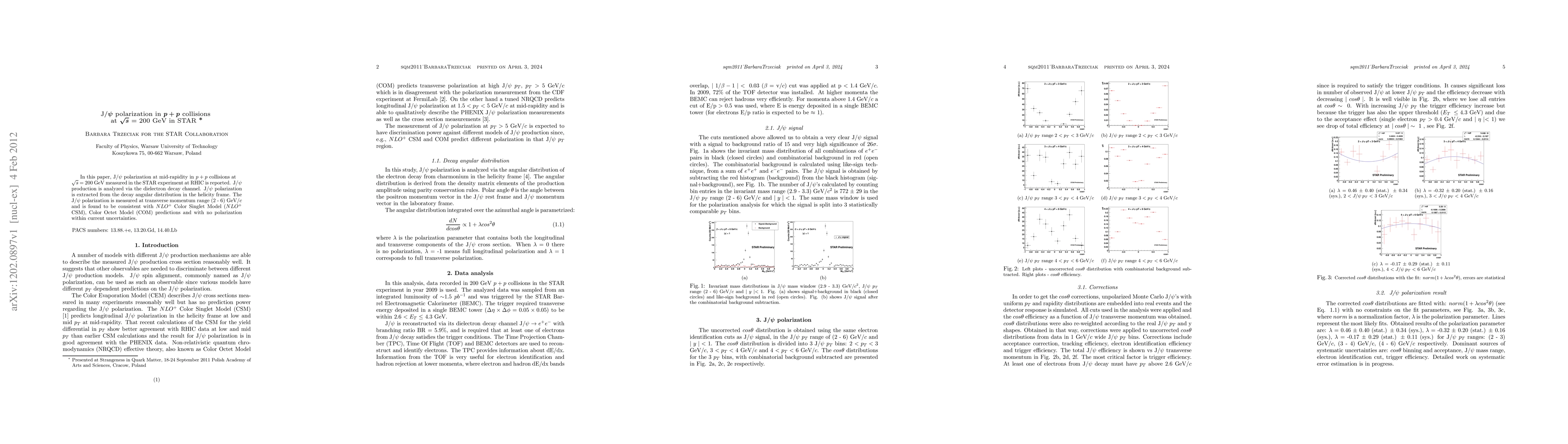 The J/ψ polarization is analyzed via the decay angular distribution of the electron from charmonium in the helicity frame. Uncorrected cosθ distributions are obtained using the same electron identification cuts as the J/ψ signal, in the J/ψ pT range of (2-6) GeV/c and |y| < 1. These distributions are then divided into 3 J/ψ pT bins: 2 < pT < 3 GeV/c, 3 < pT < 4 GeV/c, and 4 < pT < 6 GeV/c. Corrections are applied to the uncorrected cosθ distributions from data in 1 GeV/c wide J/ψ pT bins, including acceptance correction, tracking efficiency, electron identification efficiency, and trigger efficiency.