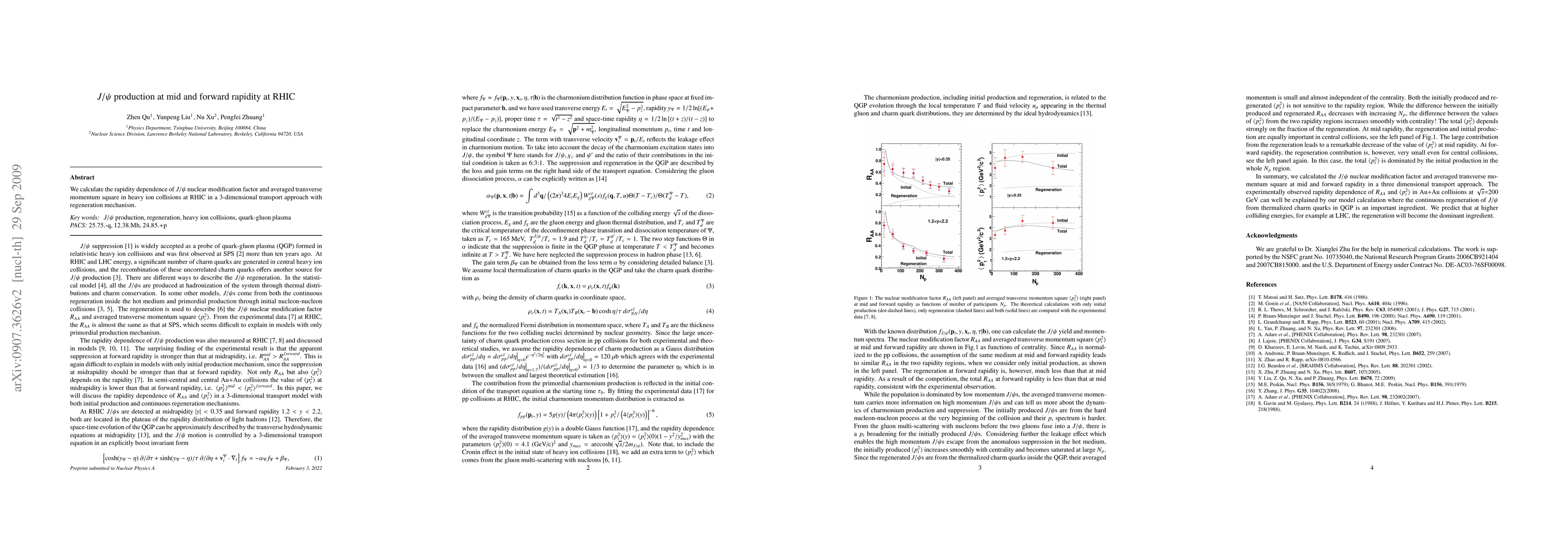 This study investigates the production of $J/\psi$ mesons at mid and forward rapidity in heavy ion collisions at RHIC using a 3-dimensional transport model that includes a regeneration mechanism, focusing on the nuclear modification factor and averaged transverse momentum. The research aims to understand the effects of nuclear matter on $J/\psi$ production through detailed theoretical modeling.