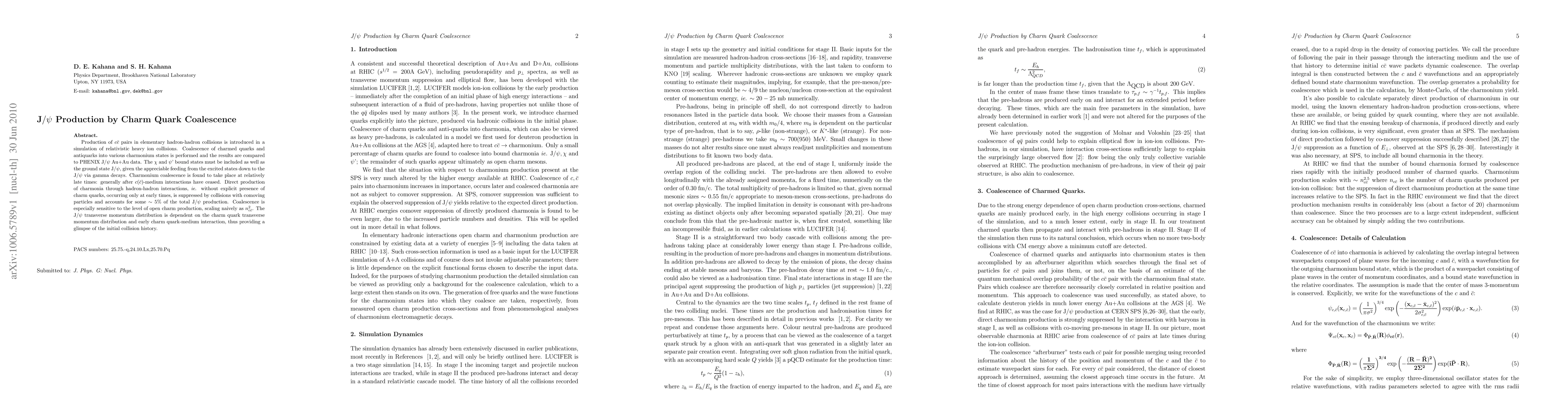 Production of $c\bar c$ pairs in elementary hadron-hadron collisions is introduced in a simulation of relativistic heavy ion collisions. Coalescence of charmed quarks and antiquarks into various charmonium states is performed and the results are compared to PHENIX J$/\psi$ Au+Au data. The $\chi$ and $\psi$' bound states must be included as well as the ground state J$/\psi$, given the appreciable feeding from the excited states down to the J$/\psi$ via gamma decays. Charmonium coalescence is found to take place at relatively late times: generally after $c$($\bar c$)-medium interactions have ceased. Direct production of charmonia through hadron-hadron interactions, {\it ie.} without explicit presence of charm quarks, occurring only at early times, is suppressed by collisions with comoving particles and accounts for some $\sim 5\%$ of the total J$/\psi$ production. Coalescence is especially sensitive to the level of open charm production, scaling naively as $n_{c\bar c}^2$. The J$/\psi$ transverse momentum distribution is dependent on the charm quark transverse momentum distribution and early charm quark-medium interaction, thus providing a glimpse of the initial collision history.