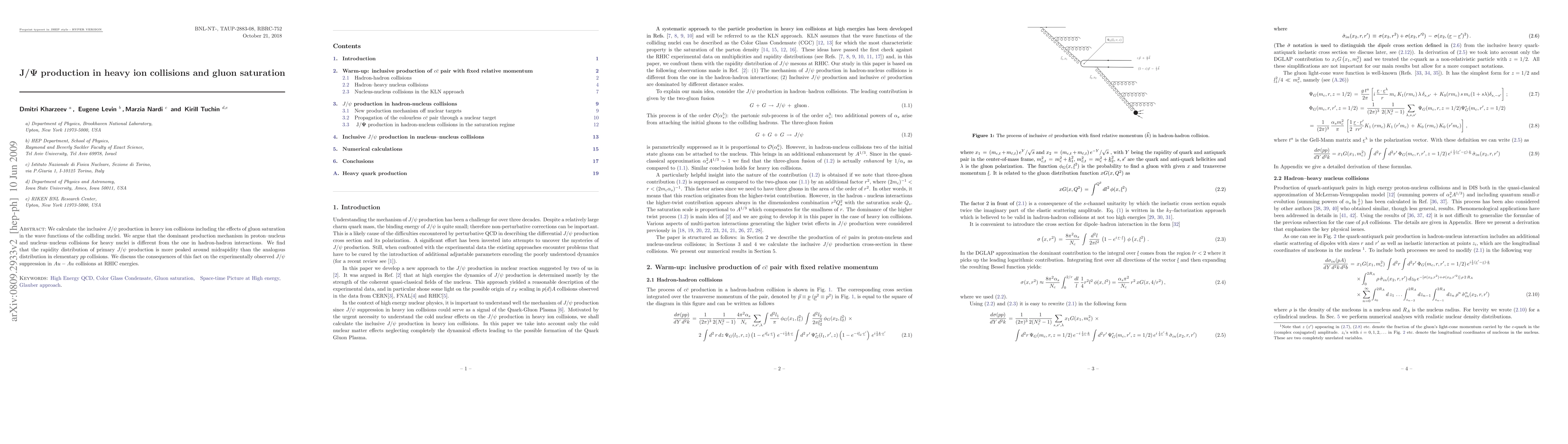 This paper investigates J/Psi production in heavy ion collisions, considering gluon saturation effects in the colliding nuclei's wave functions. It concludes that the production mechanism in heavy nuclei differs from that in hadron-hadron interactions, with a more pronounced peak in the rapidity distribution at midrapidity compared to pp collisions.