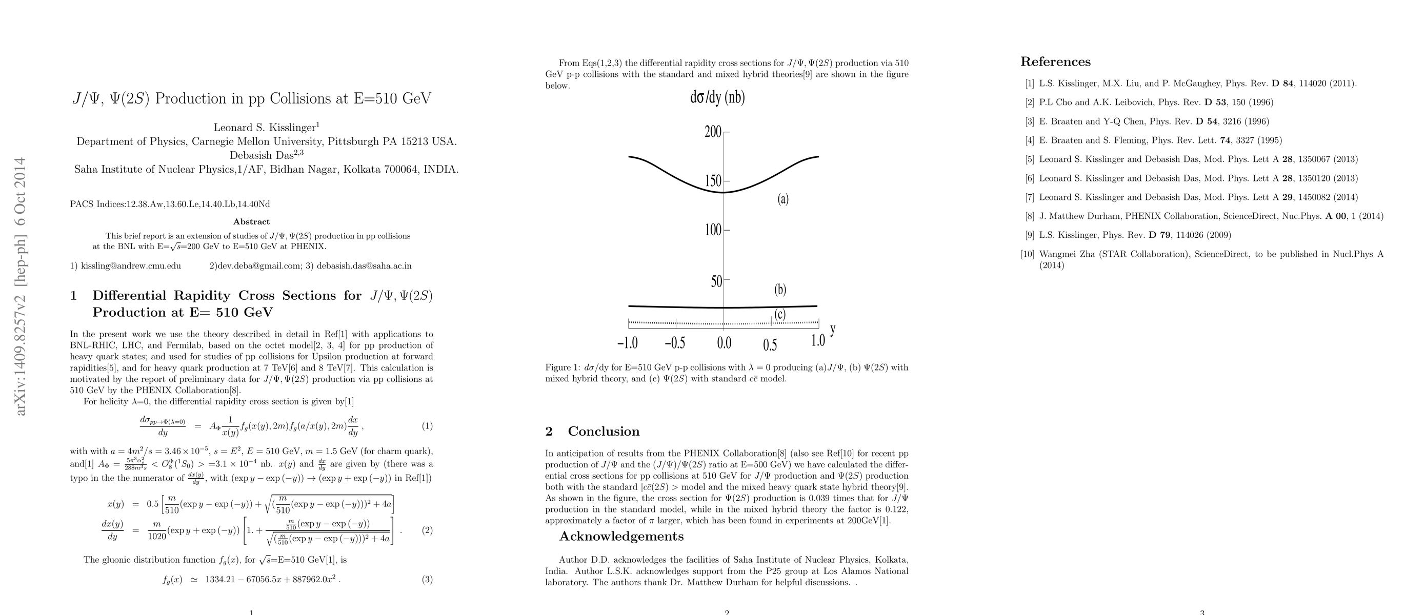 This brief report is an extension of studies of $J/\Psi,\Psi(2S)$ production in pp collisions at the BNL with E=$\sqrt{s}$=200 GeV to E=510 GeV at PHENIX.