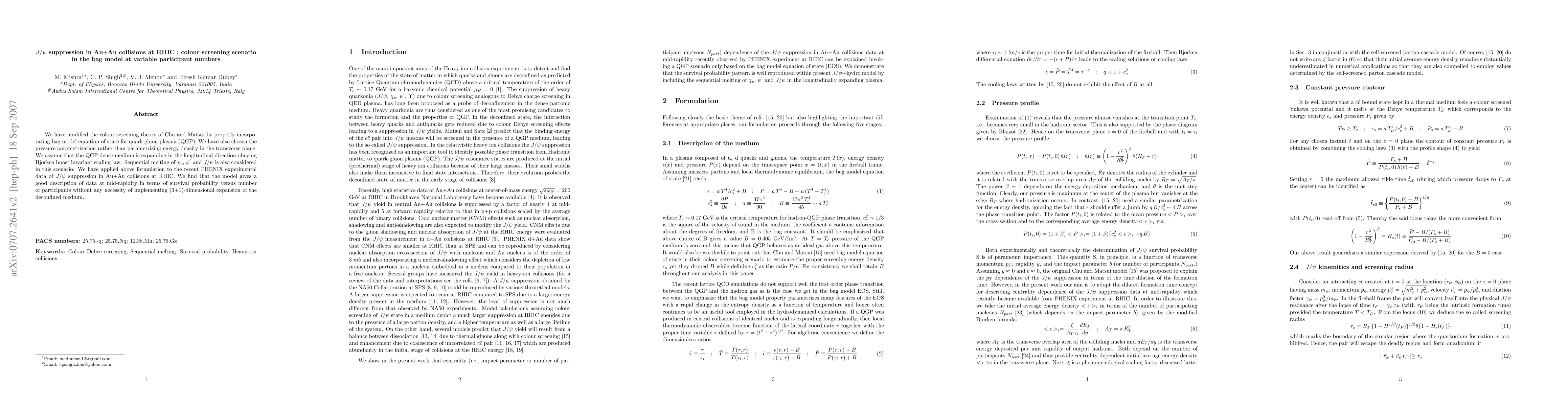 We have modified the colour screening theory of Chu and Matsui by properly incorporating bag model equation of state for quark gluon plasma (QGP). We have also chosen the pressure parametrization rather than parametrizing energy density in the transverse plane. We assume that the QGP dense medium is expanding in the longitudinal direction obeying Bjorken boost invariant scaling law. Sequential melting of $\chi_c$, $\psi^{'}$ and $J/\psi$ is also considered in this scenario. We have applied above formulation to the recent PHENIX experimental data of $J/\psi$ suppression in Au + Au collisions at RHIC. We find that the model gives a good description of data at mid-rapidity in terms of survival probability versus number of participants without any necessity of implementing (3+1)-dimensional expansion of the deconfined medium.
