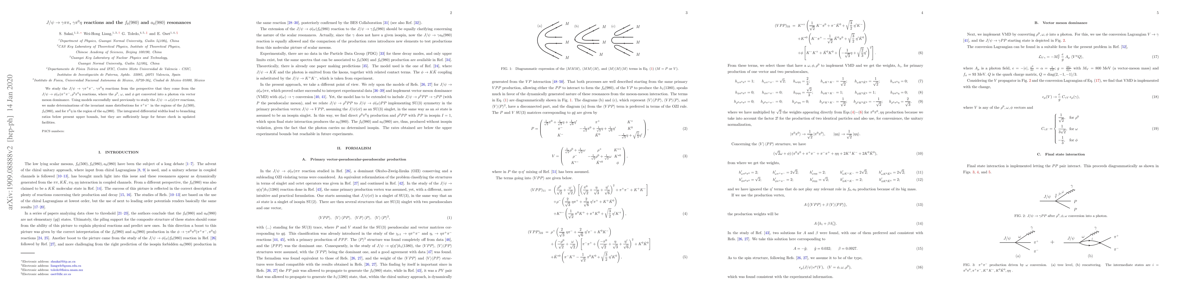 This paper investigates the $J/\psi \to \gamma \pi^+ \pi^-$ and $\gamma \pi^0 \eta$ reactions, attributing them to intermediate $\phi(\omega)\pi\pi$ and $\rho^0\pi^0\eta$ states, and determines the invariant mass distributions for these reactions, focusing on the $f_0(980)$ and $a_0(980)$ resonances. The results suggest branching ratios large enough for future experimental verification.