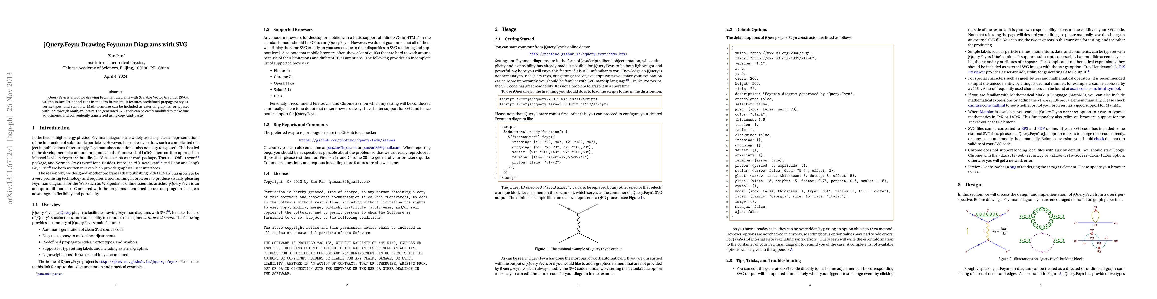 jQuery.Feyn is a JavaScript-based tool for creating Feynman diagrams with SVG, offering predefined styles and symbols, and supporting MathJax for TeX typesetting. Its SVG output is easily modifiable and transferable via copy-and-paste.