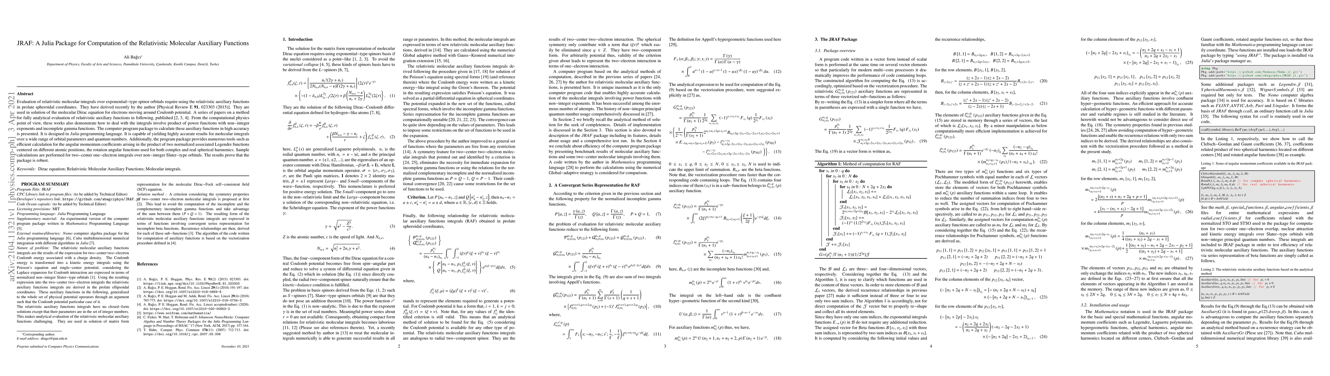 The JRAF package in Julia computes relativistic molecular auxiliary functions in prolate spheroidal coordinates, essential for solving the molecular Dirac equation. It provides highly accurate results for a wide range of orbital parameters and quantum numbers, along with tools for angular momentum coefficients and rotation functions.