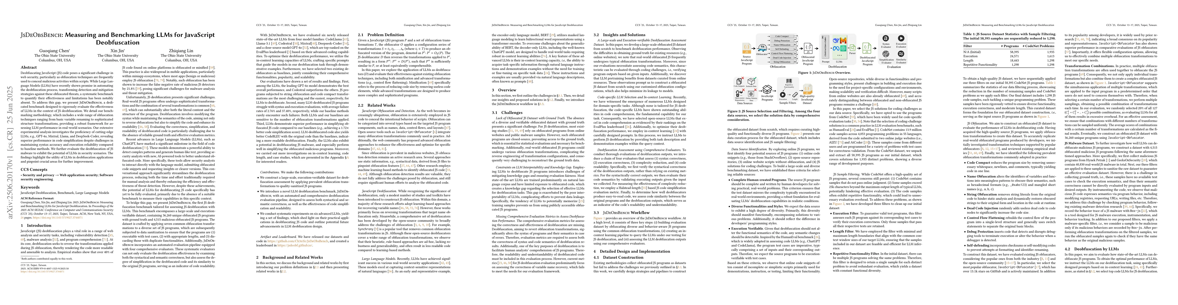 JsDeObsBench presents a benchmark to evaluate the effectiveness of LLMs in JavaScript deobfuscation, covering a wide range of obfuscation techniques and assessing syntax accuracy, execution reliability, code simplification, and similarity to original code.