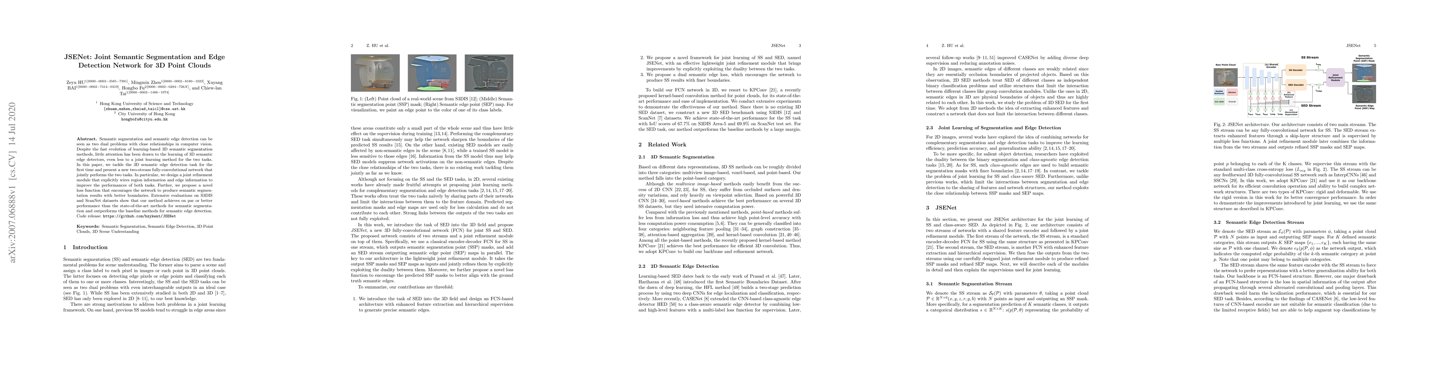 JSENet introduces a novel two-stream fully-convolutional network that jointly performs semantic segmentation and edge detection for 3D point clouds, utilizing a joint refinement module to enhance both tasks. The method achieves competitive performance on S3DIS and ScanNet datasets, outperforming baselines in semantic edge detection.