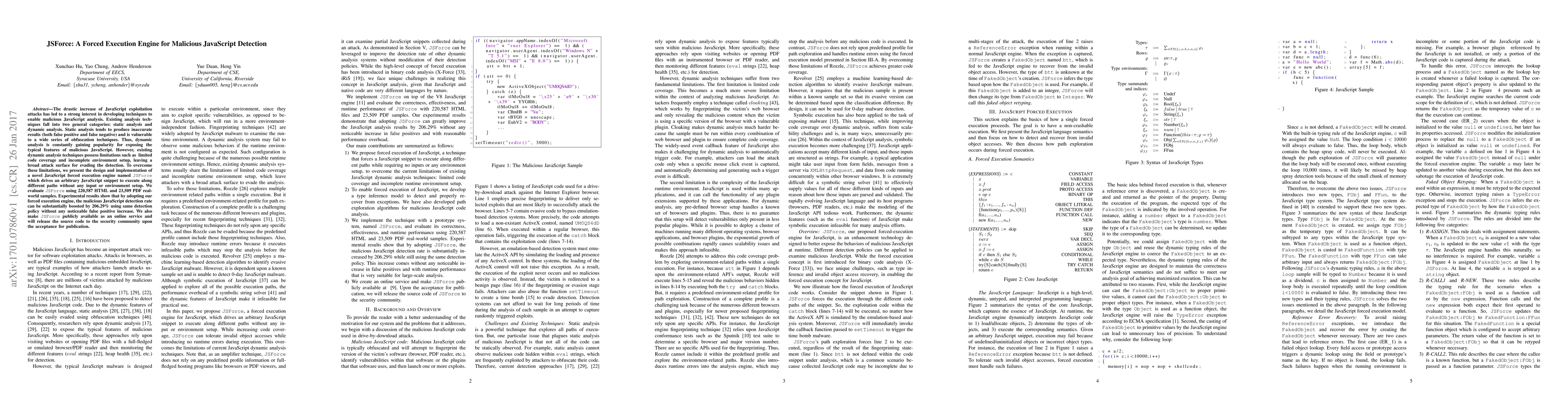 JSForce is a novel forced execution engine designed to enhance the detection of malicious JavaScript by dynamically exploring code paths without requiring input or environment setup, significantly improving detection rates by 206.29% while maintaining low false positives. The tool is publicly available online and its source code will be released to the security community upon publication.