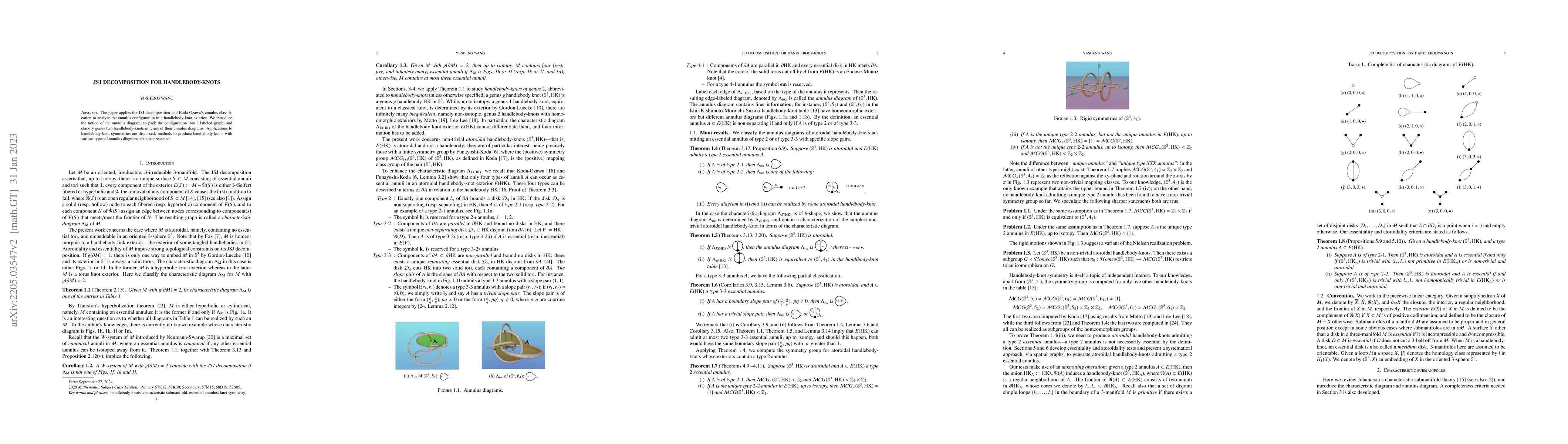 The paper utilizes JSJ decomposition and Koda-Ozawa's annulus classification to analyze annulus configurations in handlebody-knot exteriors, introducing annulus diagrams to classify genus two handlebody-knots, and discussing applications to knot symmetries and methods for producing knots with specific diagrams.