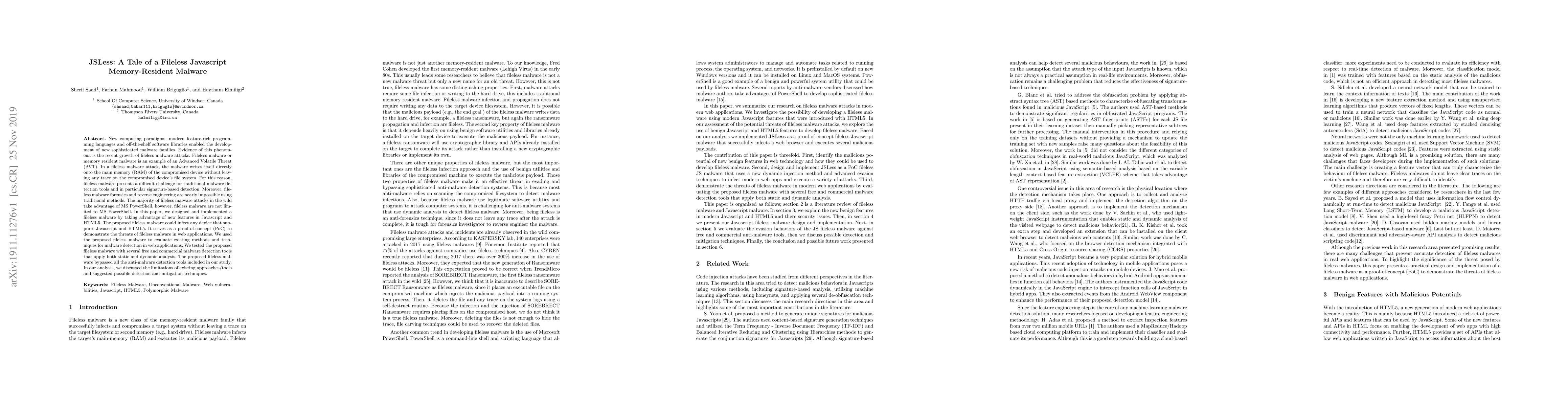 This paper introduces JSLess, a proof-of-concept fileless malware exploiting JavaScript and HTML5 to reside in memory without leaving traces on the file system, demonstrating the challenges it poses to traditional malware detection methods. The study reveals that JSLess successfully evades existing web application malware detection tools, highlighting the need for improved detection and mitigation strategies.