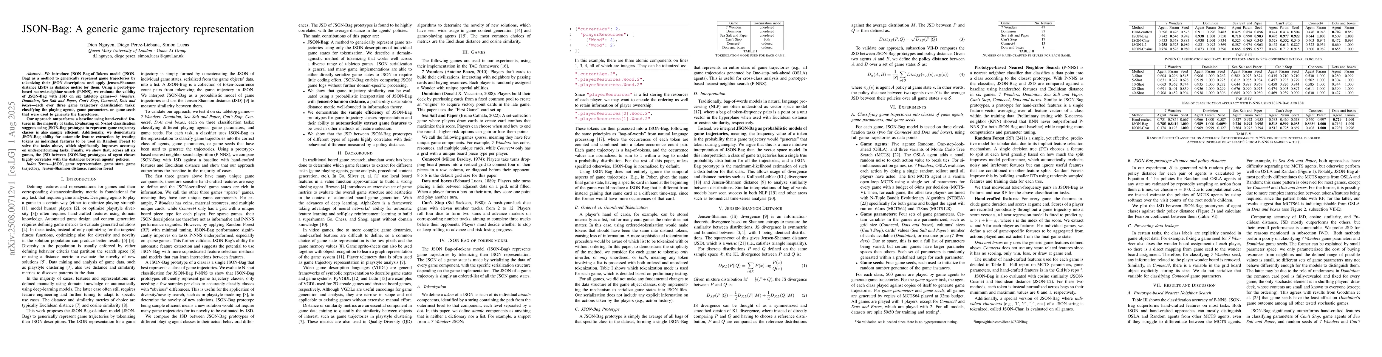 We introduce JSON Bag-of-Tokens model (JSON-Bag) as a method to generically represent game trajectories by tokenizing their JSON descriptions and apply Jensen-Shannon distance (JSD) as distance metric for them. Using a prototype-based nearest-neighbor search (P-NNS), we evaluate the validity of JSON-Bag with JSD on six tabletop games -- \textit{7 Wonders}, \textit{Dominion}, \textit{Sea Salt and Paper}, \textit{Can't Stop}, \textit{Connect4}, \textit{Dots and boxes} -- each over three game trajectory classification tasks: classifying the playing agents, game parameters, or game seeds that were used to generate the trajectories. Our approach outperforms a baseline using hand-crafted features in the majority of tasks. Evaluating on N-shot classification suggests using JSON-Bag prototype to represent game trajectory classes is also sample efficient. Additionally, we demonstrate JSON-Bag ability for automatic feature extraction by treating tokens as individual features to be used in Random Forest to solve the tasks above, which significantly improves accuracy on underperforming tasks. Finally, we show that, across all six games, the JSD between JSON-Bag prototypes of agent classes highly correlates with the distances between agents' policies.