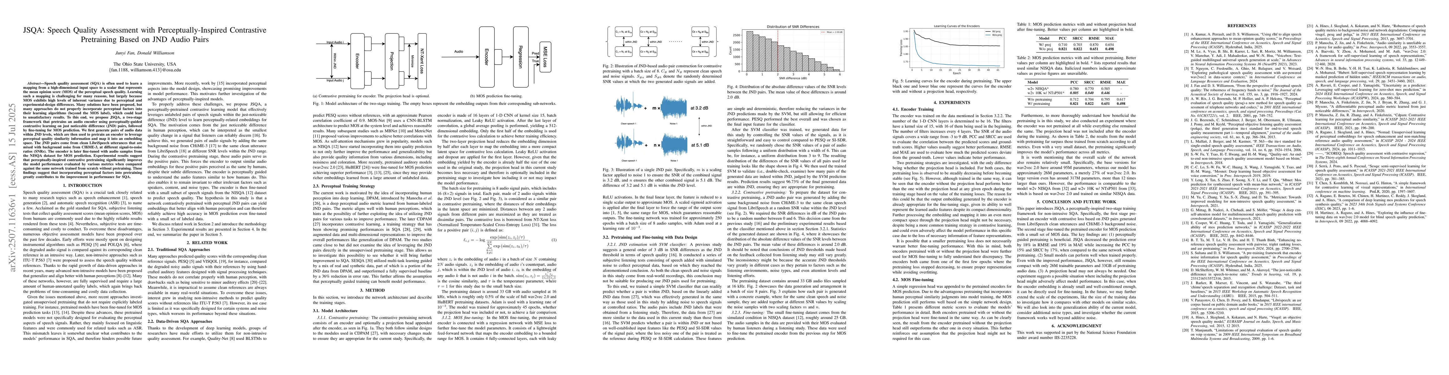 The paper proposes JSQA, a two-stage framework for speech quality assessment (SQA) that pretrains an audio encoder using perceptually-guided contrastive learning on just noticeable difference (JND) audio pairs, followed by fine-tuning for MOS prediction. JND pairs are generated from clean LibriSpeech utterances mixed with background noise from CHiME-3 at different SNRs.