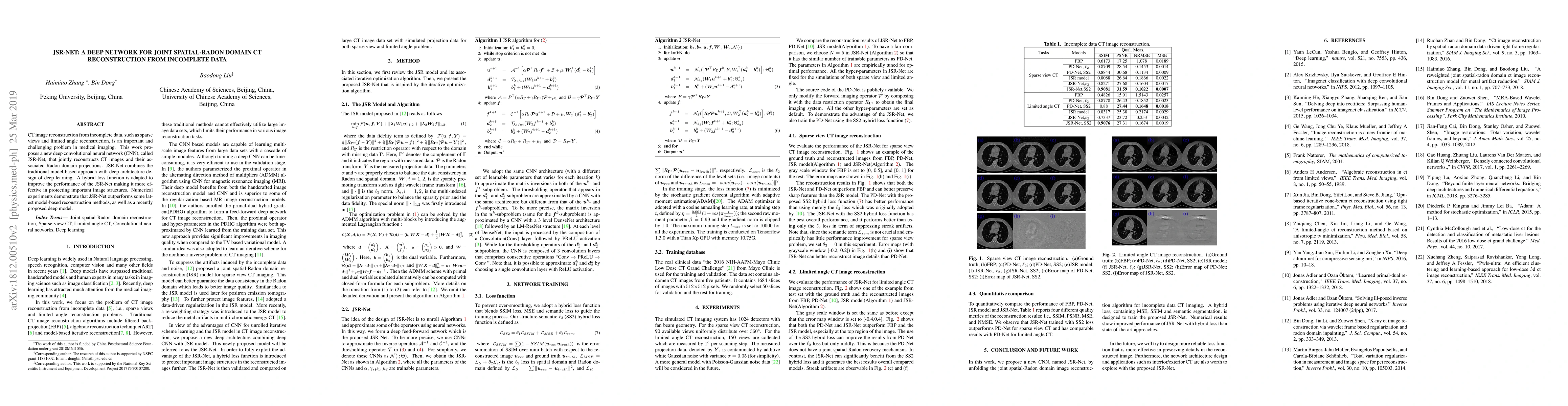 JSR-Net is a novel deep convolutional neural network designed for reconstructing CT images from incomplete data, combining traditional model-based methods with deep learning. It uses a hybrid loss function to enhance performance and preserve image structures, outperforming existing model-based and deep reconstruction methods in experiments.