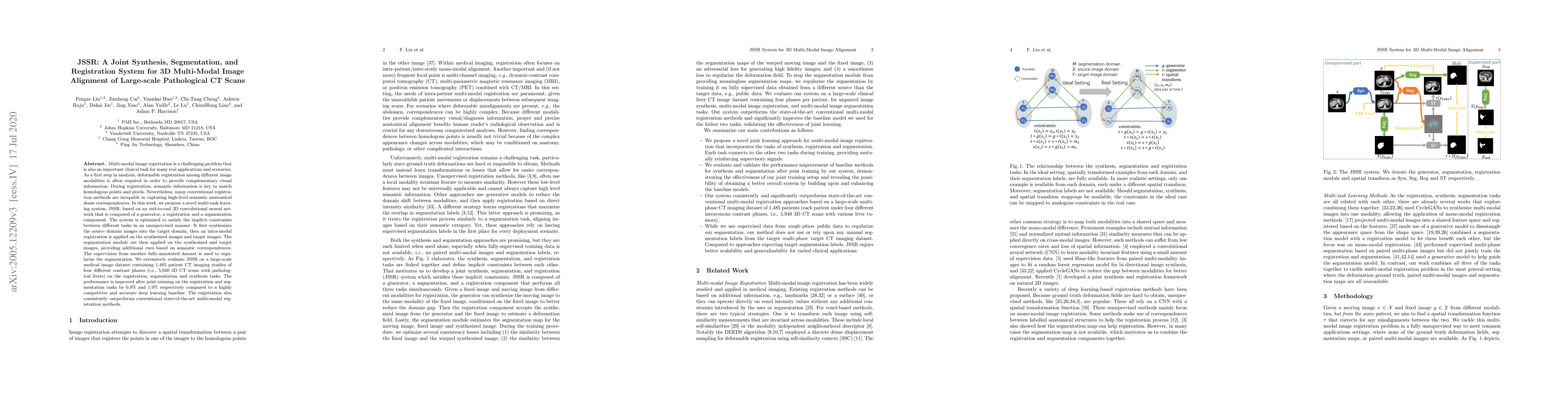 This paper proposes JSSR, a joint synthesis, segmentation, and registration system for aligning large-scale 3D multi-modal pathological CT scans. The system leverages a multi-task learning approach with a 3D convolutional neural network to achieve superior registration performance compared to conventional methods.