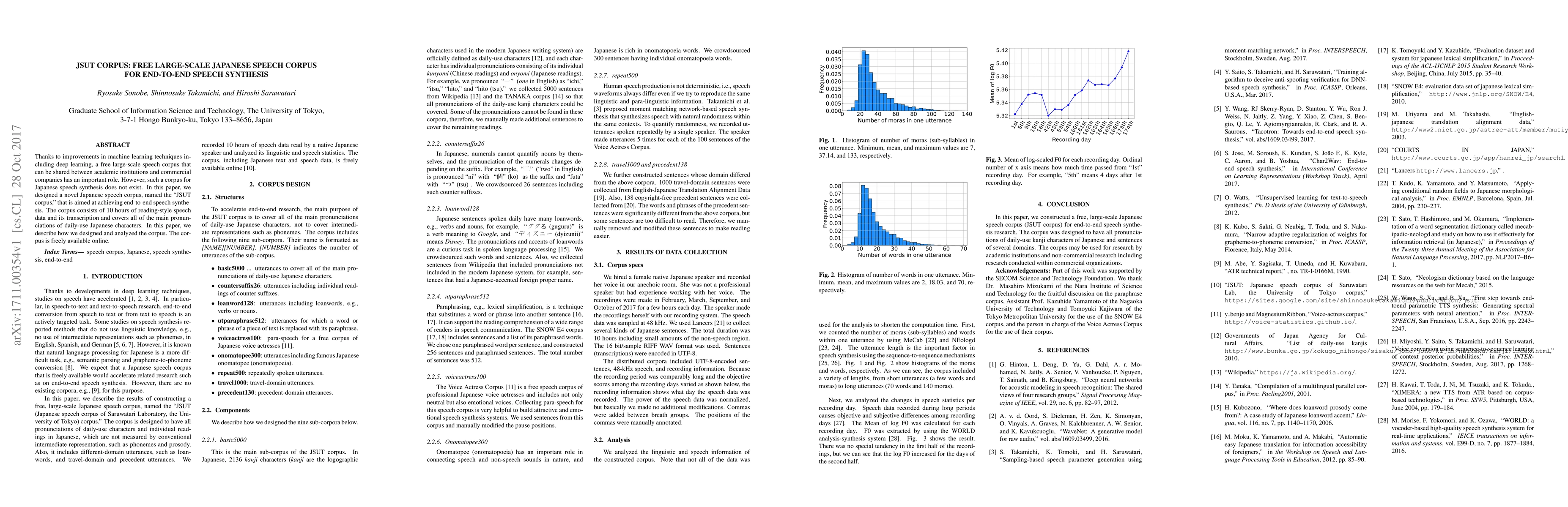 The paper introduces the JSUT corpus, a free large-scale Japanese speech dataset designed for end-to-end speech synthesis, consisting of 10 hours of reading-style speech data with transcriptions covering all main pronunciations of daily-use Japanese characters. The corpus is freely available online to support research and commercial applications.