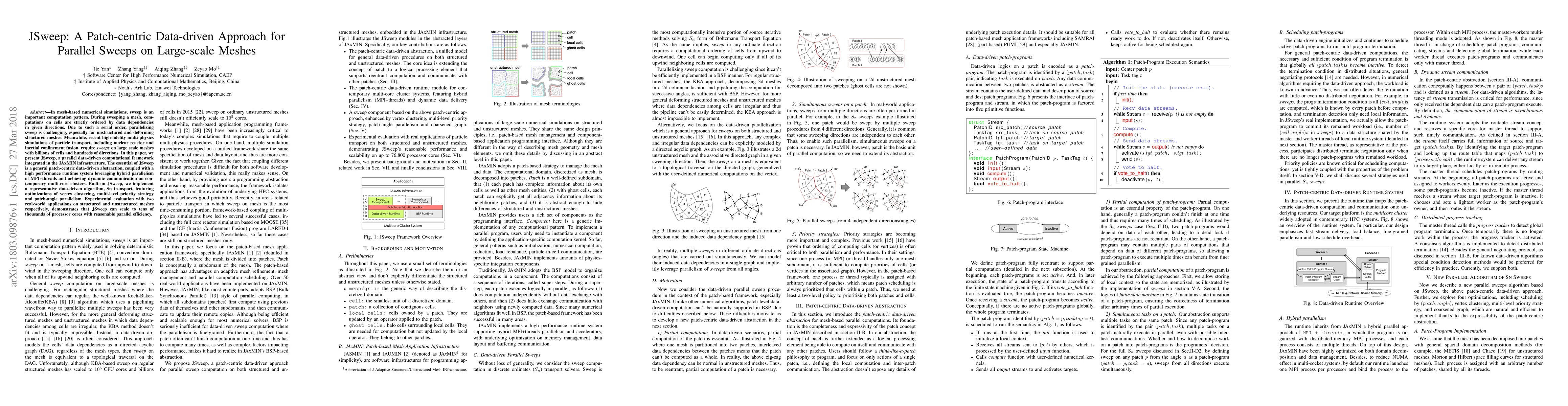 JSweep introduces a patch-centric data-driven framework for parallelizing sweep computations on large-scale meshes, leveraging hybrid parallelism and achieving dynamic communication on multi-core clusters. Experimental results show JSweep scales efficiently to tens of thousands of processor cores for applications in multi-physics simulations.
