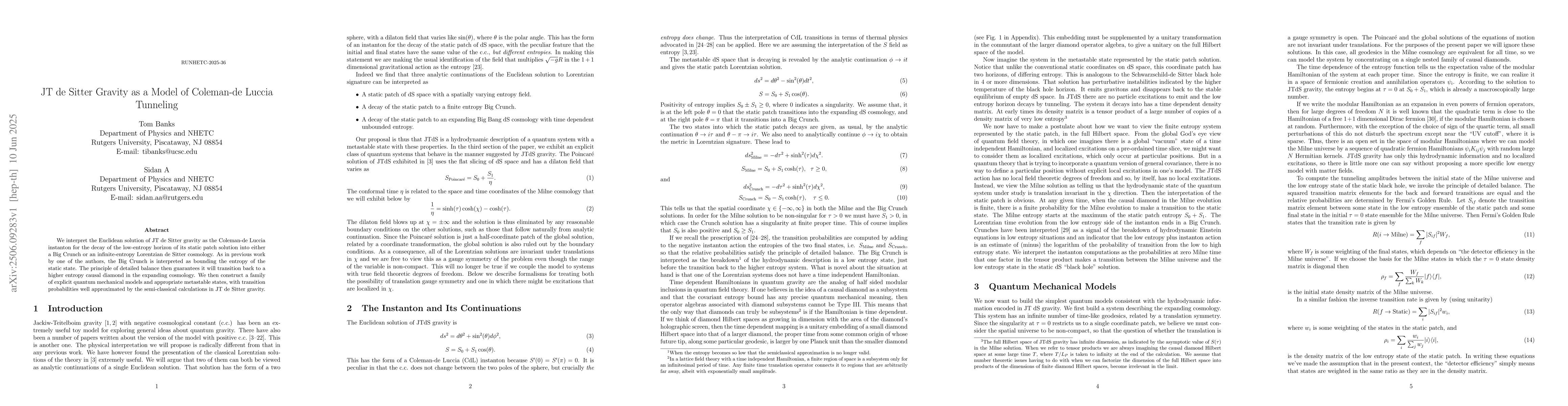 The paper presents a novel interpretation of JT de Sitter gravity as a Coleman-de Luccia tunneling model, providing a framework for understanding low-entropy state decays into higher entropy systems using quantum mechanical models with time-dependent Hamiltonians.
