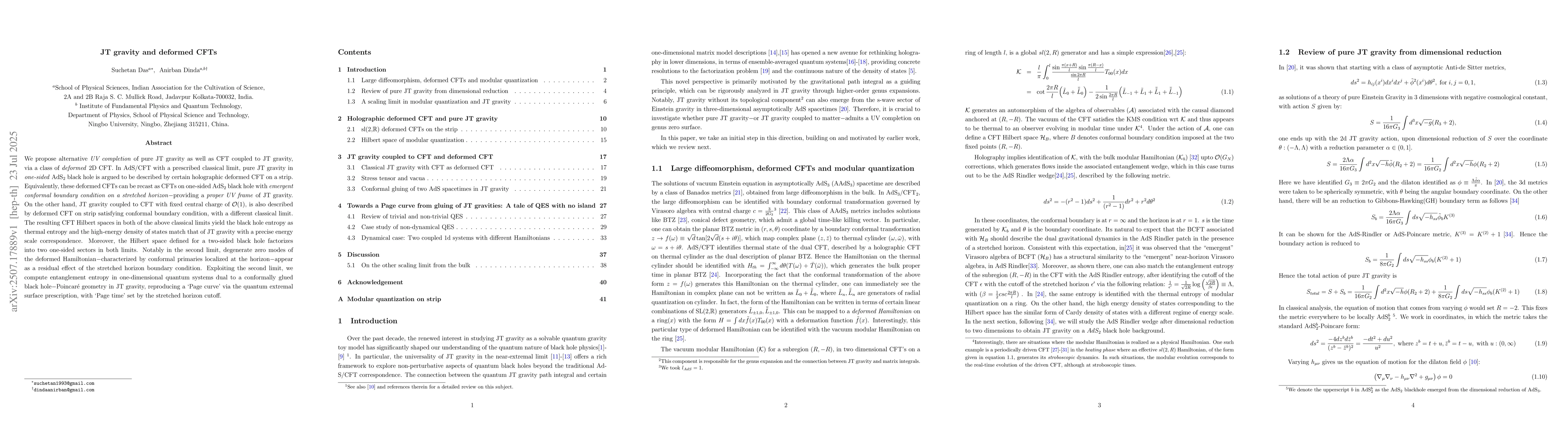 This work contributes to understanding the UV completion of JT gravity and its coupling to CFTs, providing insights into black hole entropy, entanglement entropy, and the information paradox.